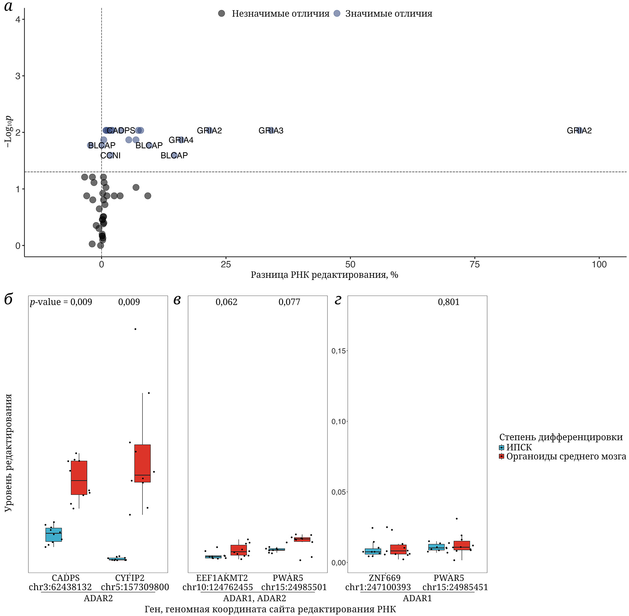 Рис. 3. Изменение уровня редактирования РНК после дифференцировки ИПСК в органоиды среднего мозга. а – Вулканная диаграмма анализа дифференциального редактирования между ИПСК и органоидами мозга; б – значимых изменений нет: сайты, предположительно, редактируемые ADAR1; в – рост на граничном уровне значимости: сайты, предположительно, редактируемые обоими ферментами ADAR; г – значимый рост: сайты-субстраты ADAR2, подтвержденные по независимым данным