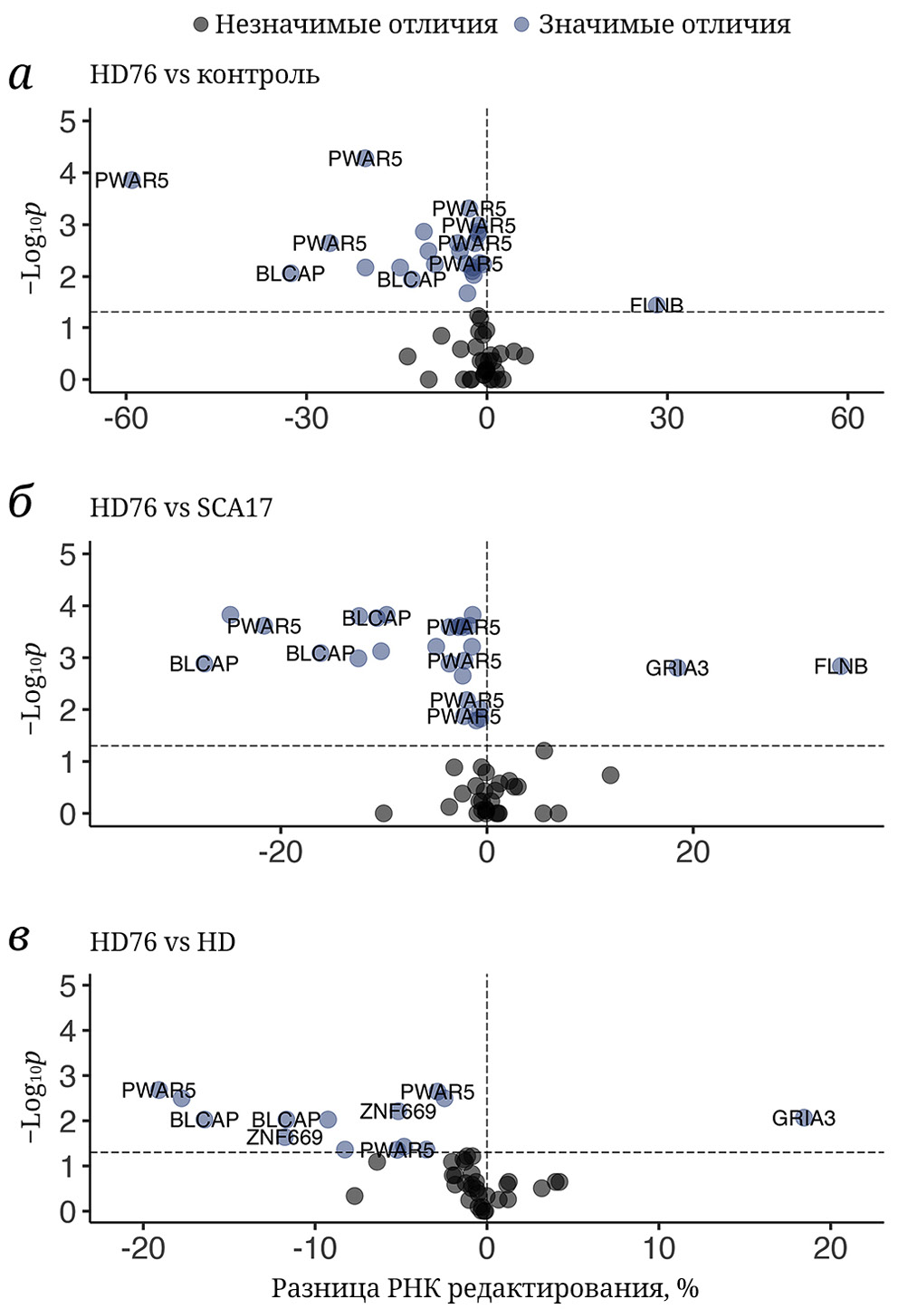 Рис. 5. Вулканные диаграммы анализа дифференциального редактирования органоидов среднего мозга, содержащих 76 повторов CAG в гене HTT (HD76). Сравнение органоидов HD76 с органоидами от здоровых доноров (а), от пациентов с SCA17 (б) и с другими двумя случаями болезни Гентингтона. Синими точками отмечены сайты со значимыми (скорректированное p-value < 0,05) изменениями уровня редактирования. Ось X представляет разницу в уровне редактирования РНК (%); ось Y отражает log10p-value (скорректированное)