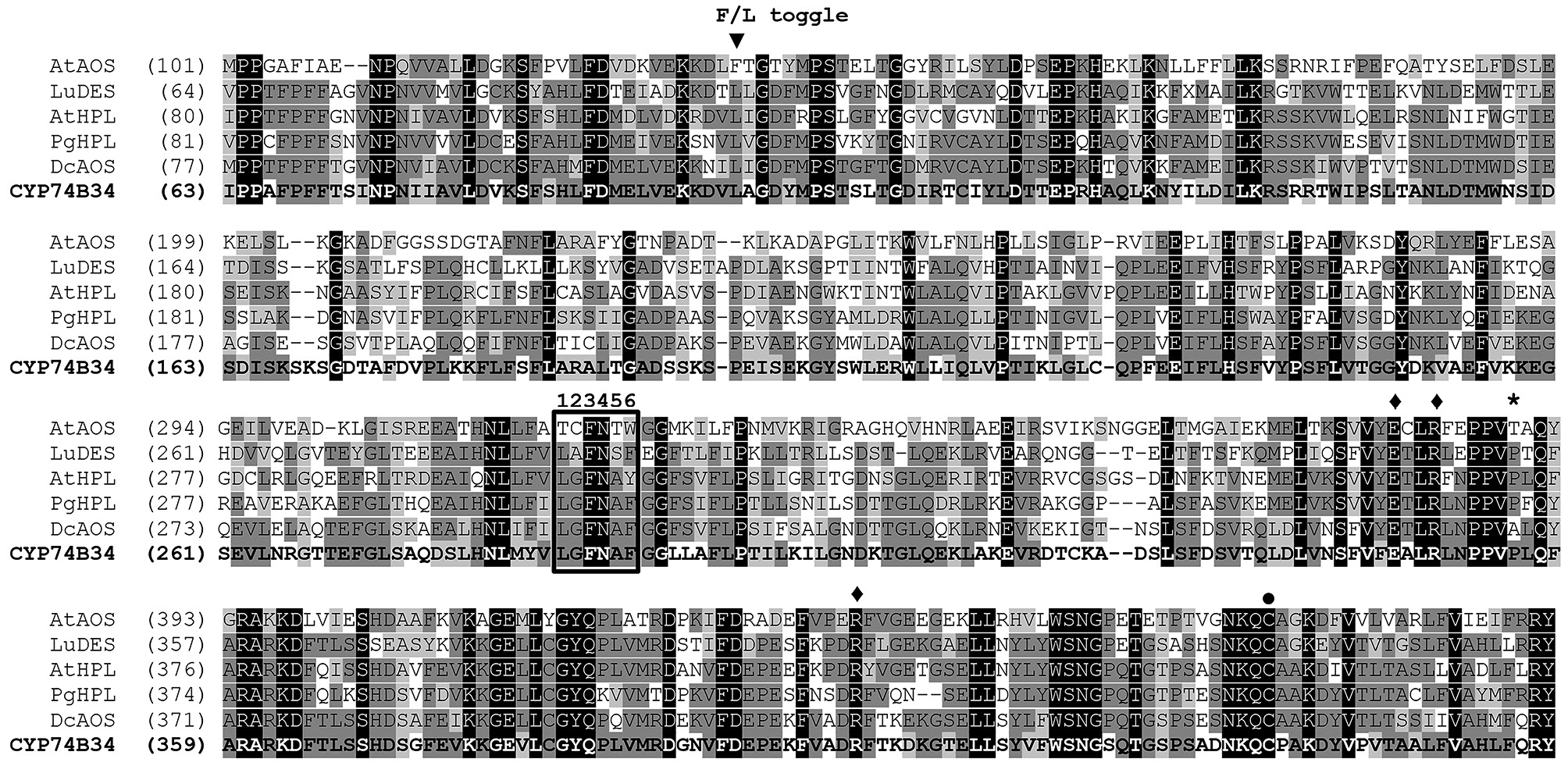 Рис. 1. Множественное выравнивание частичных аминокислотных последовательностей фермента CYP74B34 и описанных ранее представителей CYP74: At – Arabidopsis thaliana, AtAOS, NP_199079.1, AtHPL Q9ZSY9.1; Lu – Linum usitatissimum, LuDES, ADP03054.2; Pg – Psidium guajava, PgHPL, AAK15070.1; Dc – Daucus carota, DcAOS WOH02659.1. Стрелкой указан сайт «F/L toggle»; участок перегиба I-спирали обведен рамкой и пронумерован. ERR-триада и цистеин в гем-связывающем домене указаны ♦ и ● соответственно. Сайт внутри PPV-мотива, в котором были произведены замены в последовательностях ферментов CYP74B33 (DcAOS) и CYP74B34, обозначен звездочкой
