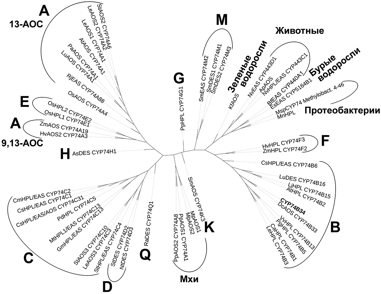 Оксилипины – биоактивные метаболиты, образующиеся при окислении полиненасыщенных жирных кислот (ПНЖК), широко распространены во всех организмах: животных, растениях, бактериях, грибах и водорослях [1–6]. Это семейство структурно разнообразных соединений может образовываться в результате как неферментативных, так и ферментативных реакций [7–10]. Биосинтез большинства растительных оксилипинов начинается с липоксигеназ (ЛОГ), превращающих линолевую и α-линоленовую кислоты в соответствующие 9- или 13-гидроперекиси, которые являются субстратами для нескольких типов ферментов, включая алленоксидсинтазы (АОС), гидропероксидлиазы (ГПЛ), дивинилэфирсинтазы (ДЭС), эпоксиалкогольсинтазы (ЭАС), пероксигеназы, редуктазы, а также для вторичных превращений, катализируемых ЛОГ [10, 11]. Из этих ферментов четыре (АОС, ГПЛ, ДЭС и ЭАС) образуют отдельное семейство CYP74 цитохромов Р450, основанное на сходстве белковых последовательностей и биохимических свойств [2, 12, 13]. Семейство CYP74 растений входит в состав клана CYP74, наряду с CYP74-подобными ферментами протеобактерий [2], бурых водорослей [14], а также некоторых животных [2, 15–18], которые по требованиям номенклатуры (более 40% идентичности аминокислотных последовательностей) нельзя отнести к семейству CYP74. Поэтому было введено понятие клана CYP74 [19], объединяющего ферменты семейства CYP74, а также представителей других семейств, проявляющих сходство с этими ферментами по структуре, механизмам каталитического действия и результатам филогенетических исследований. Интересно, что в последние годы среди членов клана CYP74 мы обнаружили ферменты, проявляющие несколько активностей, такие как LuDES/HPL с дополнительной эпоксиалкогольсинтазной активностью [20].