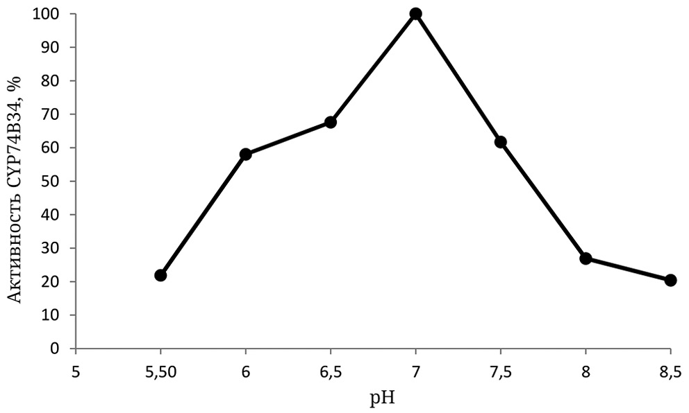 Рис. 3. Зависимость уровня каталитической активности фермента CYP74B34 от значения рН реакционной смеси