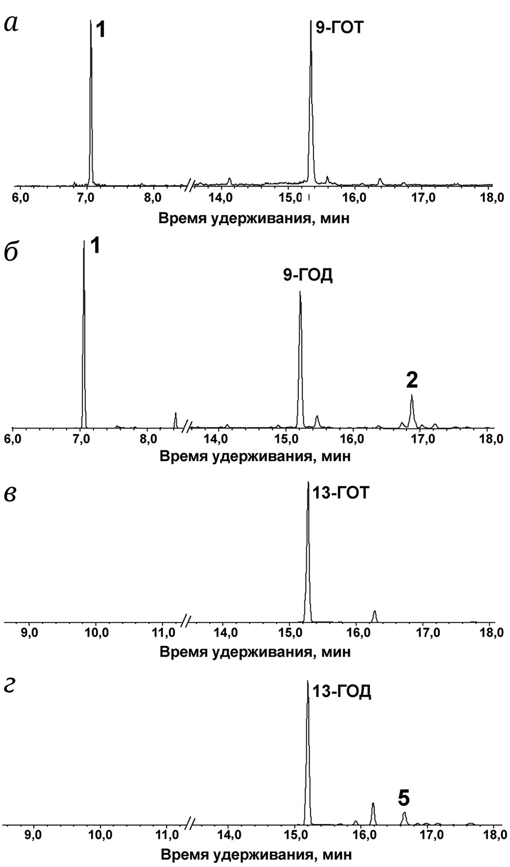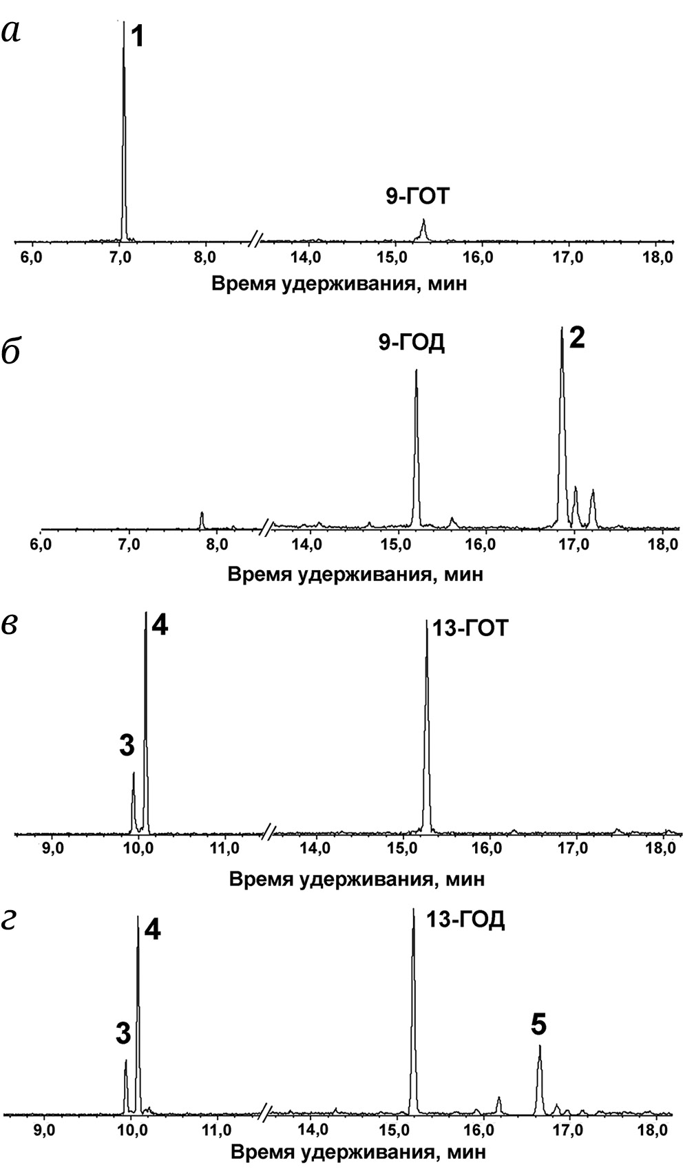 Рис. 5. Хроматограммы полного ионного тока продуктов (Ме/ТМС после восстановления с помощью NaBH4) превращения 9-ГПОТ (а), 9-ГПОД (б), 13-ГПОД (в) и 13-ГПОТ (г) при участии рекомбинантного фермента CYP74B34 дикого типа. 9-ГОД – (9S,10E,12Z)-9-гидрокси-10,12-октадекадиеновая кислота; 9-ГОТ – (9S,10E,12Z,15Z)-9-гидрокси-10,12,15-октадекатриеновая кислота; 13-ГОД – (9Z,11E,13S)-13-гидрокси-9,11-октадекадиеновая кислота; 13-ГОТ – (9Z, 11E,13S,15Z)-13-гидрокси-9,11,15-октадекатриеновая кислота