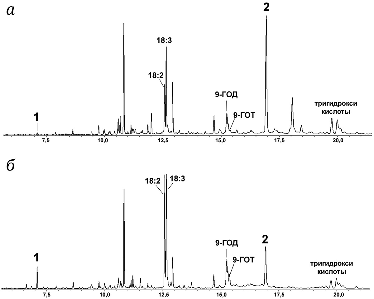 Рис. 7. Хроматограммы полного ионного тока продуктов (Ме/ТМС после восстановления с помощью NaBH4) инкубации гомогенатов молодых (а) и старых (б) корней растений моркови с линолевой и α-линоленовой кислотами. 1 – 9-гидроксинонановая кислота; 2 – 9,10-эпокси-11-гидрокси-12-октадеценовая кислота; 9-ГОД – (9S,10E,12Z)-9-гидрокси-10,12-октадекадиеновая кислота; 9-ГОТ – (9S,10E,12Z,15Z)-9-гидрокси-10,12,15-октадекатриеновая кислота; 18:2 – линолевая кислота; 18:3 – α-линоленовая кислота
