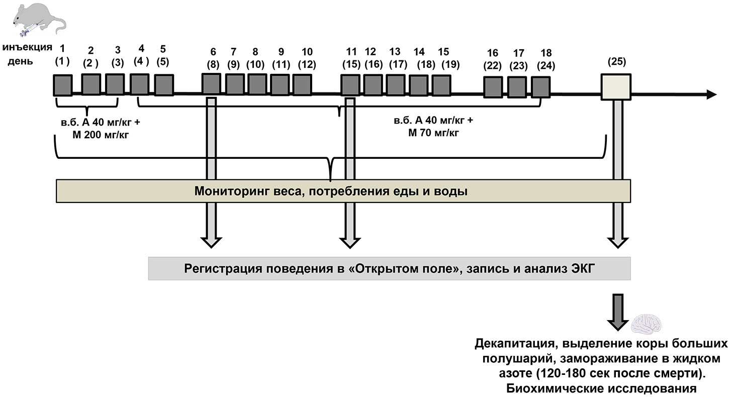 Рис. 1. Схема экспериментов на животных. В указанные дни в течение 24 дней вводили инъекции метформина (М) и ампролиума (А). За первыми тремя инъекциями метформина в дозе 200 мг/кг массы тела следовали 15 инъекций метформина в дозе 70 мг/кг массы тела. Каждая из инъекций метформина сопровождалась второй инъекцией ампролиума в дозе 40 мг/кг массы тела. Физиологические и биохимические тесты проводили в указанные дни, как описано в разделе «Материалы и методы»