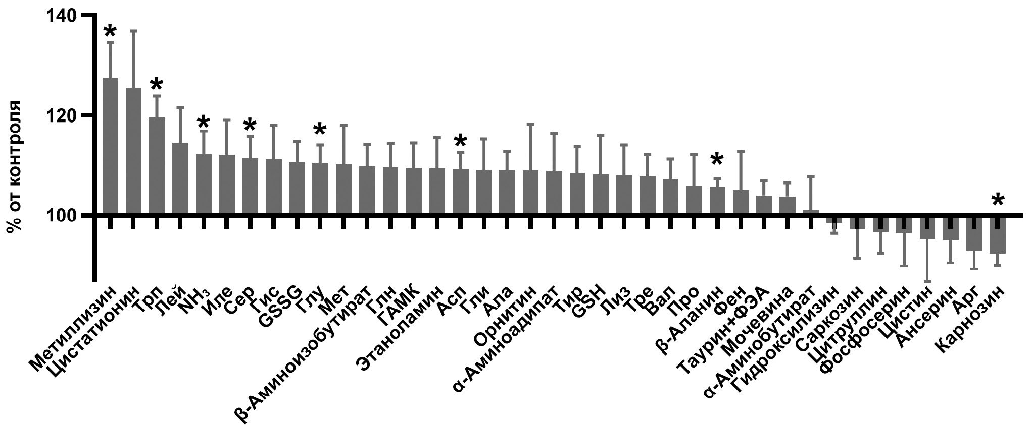 Рис. 4. Изменения (в %) содержания аминокислот и родственных соединений в коре головного мозга крыс, получавших метформин/ампролиум, по сравнению с контрольными животными (n = 12 в каждой группе). Исключённые из статистического анализа выбросы не показаны, поскольку находятся за пределами диапазона оси Y. * Достоверное отличие от контрольных значений, принятых за 100%
