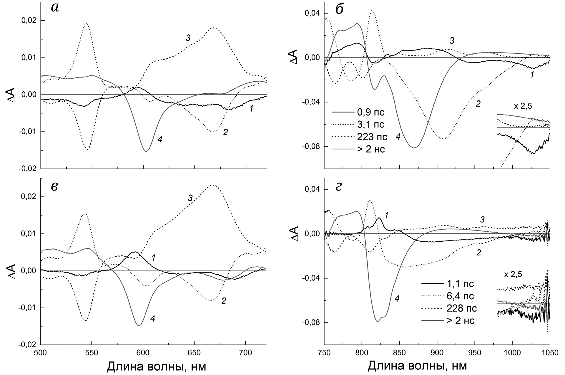 Рис. 5. DADS для РЦ C. sphaeroides дикого типа (а, б) и РЦ двойного мутанта H(L173)L/I(L177)H (в, г) в видимой (500–720 нм) и ближней ИК (750–1050 нм) спектральных областях. Вставки на панелях (б) и (г) показывают спектральные особенности в интервале 980–1050 нм на шкале ΔA, увеличенной в 2,5 раза