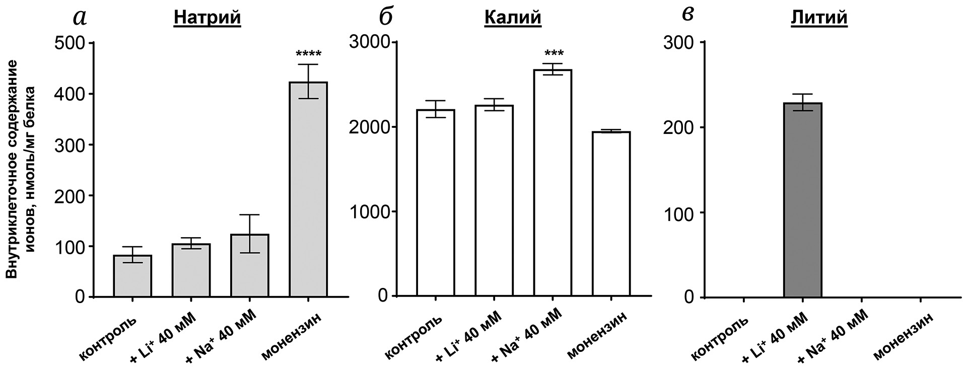 Рис. 1. Влияние 40 мМ LiCl, 40 мМ NaCl и 1,2 мкг/мл монензина, добавленных в культуральную среду, на внутриклеточное содержание ионов Na+ (а), K+ (б) и Li+ (в) в HUVEC. Клетки инкубировали в экспериментальных условиях в течение 1,5 ч. Значения представлены как среднее ± SE (n = 4–6). Значимые различия рассчитывали с помощью одностороннего ANOVA; * p < 0,05; *** p < 0,001; **** p < 0,0001