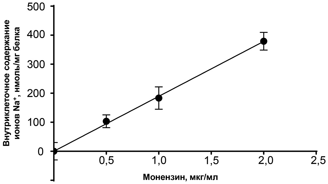 Рис. 2. Зависимость внутриклеточного содержания Na+ в HUVEC от концентрации монензина в культуральной среде. Клетки инкубировали в среде, содержащей монензин, в течение 1,5 ч. Значения представлены как среднее ± SE (n = 4–6)