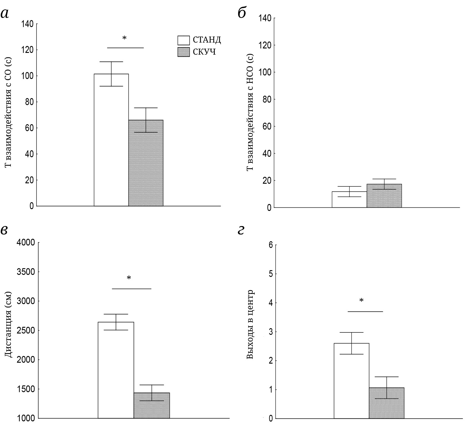 Рис. 1. Влияние содержания в условиях повышенной скученности на различные показатели поведения крыс в тесте на социальное предпочтение. СТАНД – Группа крыс, содержащихся в стандартных условиях; СКУЧ – группа крыс, проживающих в условиях повышенной скученности; Т – время; * p < 0,05 – статистически значимые различия между группами СТАНД и СКУЧ (One-Way ANOVA)