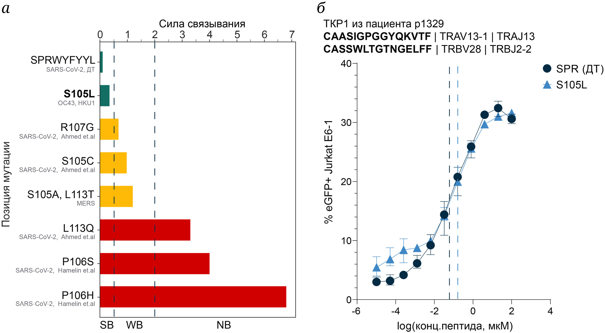 Рис. 2. Влияние мутаций в эпитопе SPR на презентацию в HLA и распознавание SPR-специфичными Т-клетками. а – Предсказанная при помощи NetMHCPan 4.1 аффинность связывания пептида дикого типа (ДТ) SPR и его гомологов с HLA-B*07:02. Зеленым обозначены варианты с высокой силой связывания (SB; ранг < 0,5); желтым – варианты со слабой аффинностью (WB; ранг 0,5–2); красным – варианты, не способные к презентации в данной HLA (NB; ранг > 2). Гомолог, выбранный для анализа кросс-реактивного ответа, выделен жирным шрифтом. б – Кривая титрования для определения функциональной авидности SPR-специфичного ТКР1 к пептиду дикого типа (синий) и мутантному пептиду S105L (голубой). На графике отображена средняя доля клеток eGFP+ и стандартное отклонение; EC50 отмечено прерывистой линией