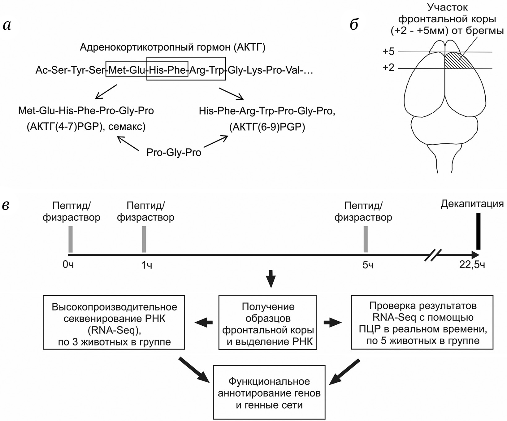 Рис. 1. Структура пептидов АКТГ(4–7)PGP (семакс) и АКТГ(6–9)PGP (а). Схематическое изображение среза мозга крысы с указанием штриховкой локализации участка лобной коры, взятого для секвенирования РНК (б). Схема исследования (в)