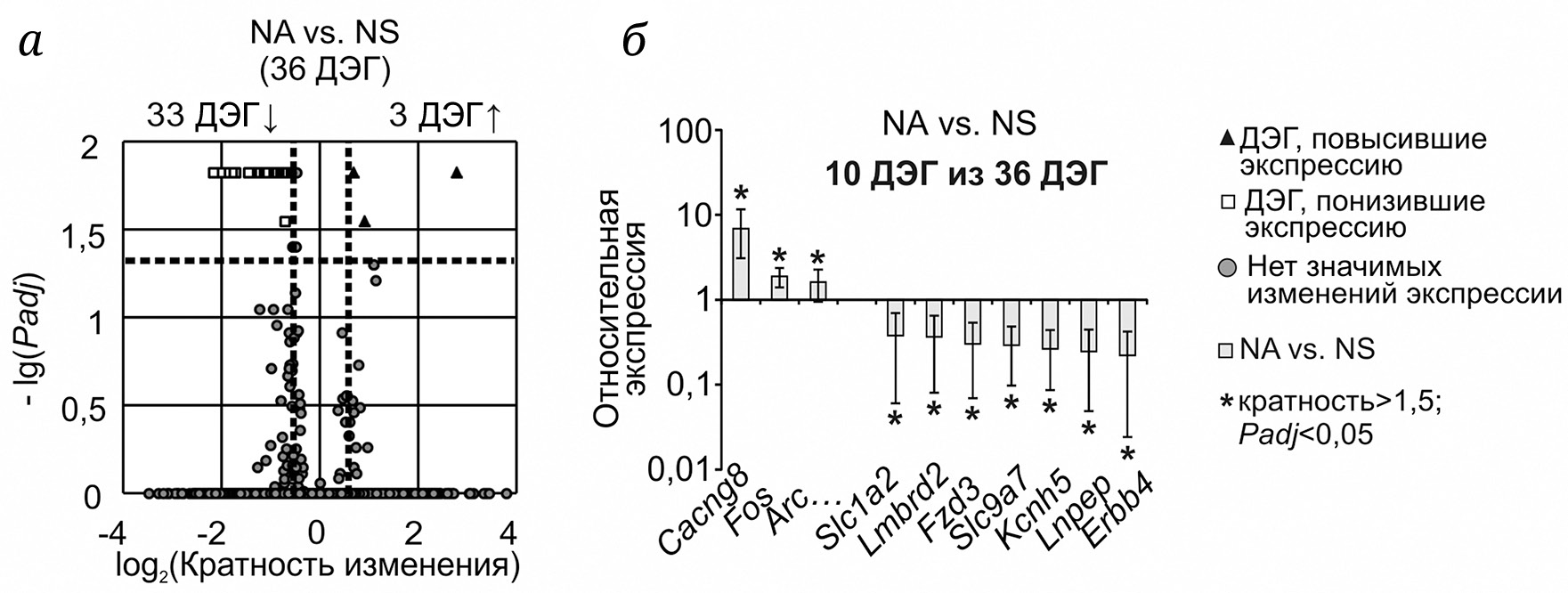 Cравнение результатов RNA-Seq в экспериментах с введением АКТГ(6–9)PGP крысам относительно действия семакса. В условиях эксперимента в участке фронтальной коры крыс после введения АКТГ(6–9)PGP по сравнению с группой животных, получавшей семакс (NA vs. NS), мы выявили 36 ДЭГ (3 повысивших и 33 снизивших экспрессию). График «volcano plot» иллюстрирует различия в экспрессии мРНК между группами NA и NS (рис. 4. а). Отдельно 10 генов (Cacng8, Fos, Arc, Slc1a2, Lmbrd2, Fzd3, Slc9a7, Kcnh5, Lnpep, Erbb4) с максимальной кратностью изменений экспрессии в сравнении NA vs. NS показаны на рис. 4, б.