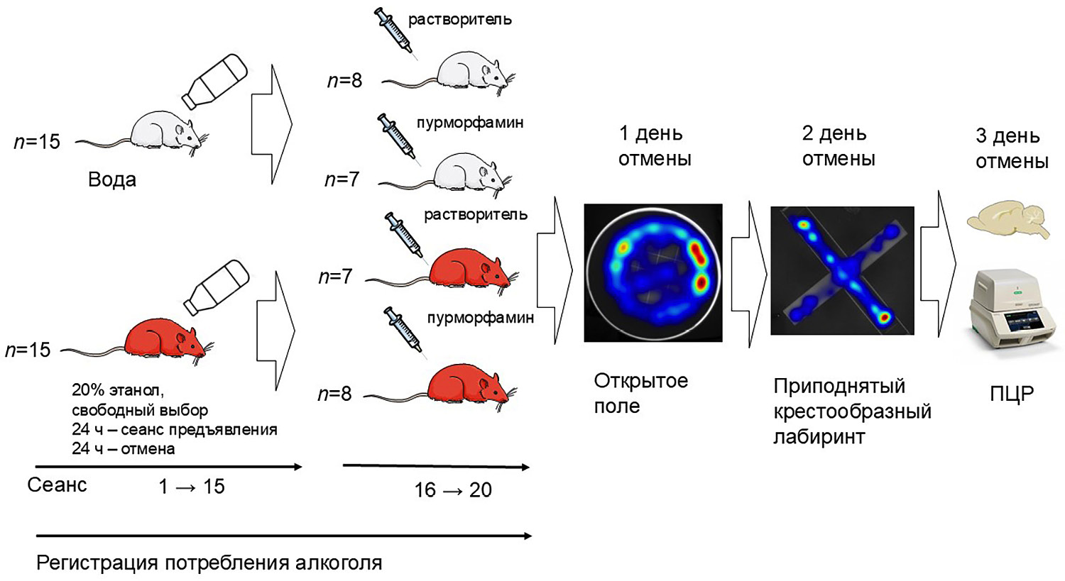 Рис. 1. Схема эксперимента. В работе использовали модель прерывистого доступа к 20%-ному раствору этилового спирта в условиях свободного выбора, согласно которой раствор спирта предъявляли совместно с водой на период 24 ч с последующей заменой спирта водой на 24 ч. Активатор каскада Hh, проявляющий свойства агониста рецептора Smo, пурморфамин вводили системно в дозе 5 мг/кг перед 16–20 сеансами предъявления алкоголя. Потребление алкоголя регистрировали в течение 20 сеансов предъявления, затем алкоголь отменяли. Тревожно-подобное поведение оценивали в открытом поле и приподнятом крестообразном лабиринте через сутки и двое суток после отмены алкоголя соответственно. На третий день после отмены алкоголя оценивали уровень мРНК элементов сигнального каскада Shh, Ptch, Smo и Gli во фронтальной коре, амигдале, гиппокампе и стриатуме