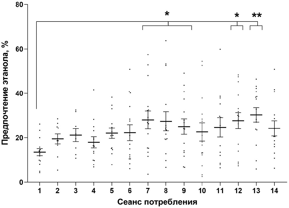 Рис. 2. Динамика предпочтения этанола воде в модели прерывистого доступа к 20%-ному раствору этанола в условиях свободного выбора. Данные представлены в виде среднего арифметического ± ошибка среднего. Достоверность различий от уровня предпочтения спирта воде после первого сеанса предъявления спирта (модель со смешанными эффектами и критерий Даннета для множественного сравнения): * p < 0,05; ** p < 0,005