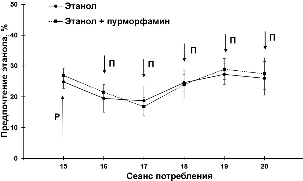 Рис. 3. Влияние пурморфамина на предпочтение раствора этанола воде в модели прерывистого доступа в условиях свободного выбора. Р – рандомизация по уровню предпочтения за последние 5 сеансов перед началом серии введений пурморфамина. П – внутрибрюшинное введение пурморфамина в дозе 5 мг/кг за один час перед 16–20 сеансами предъявления этанола. Данные представлены в виде среднего арифметического ± ошибка среднего