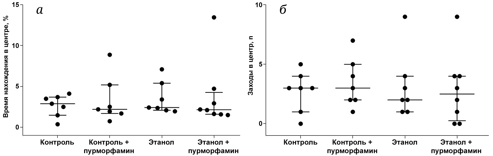 Рис. 4. Влияние пурморфамина на тревожно-подобное поведение в открытом поле после реализации модели прерывистого доступа к этанолу в условиях свободного выбора. Пурморфамин вводили внутрибрюшинно в дозе 5 мг/кг за один час перед 16–20 сеансами предъявления этанола. Тест «Открытое поле» проводили через сутки после отмены алкоголя. а – Время нахождения в центральной зоне арены; б – число заходов в центральную зону арены. Данные представлены в виде медианы и межквартильного интервала