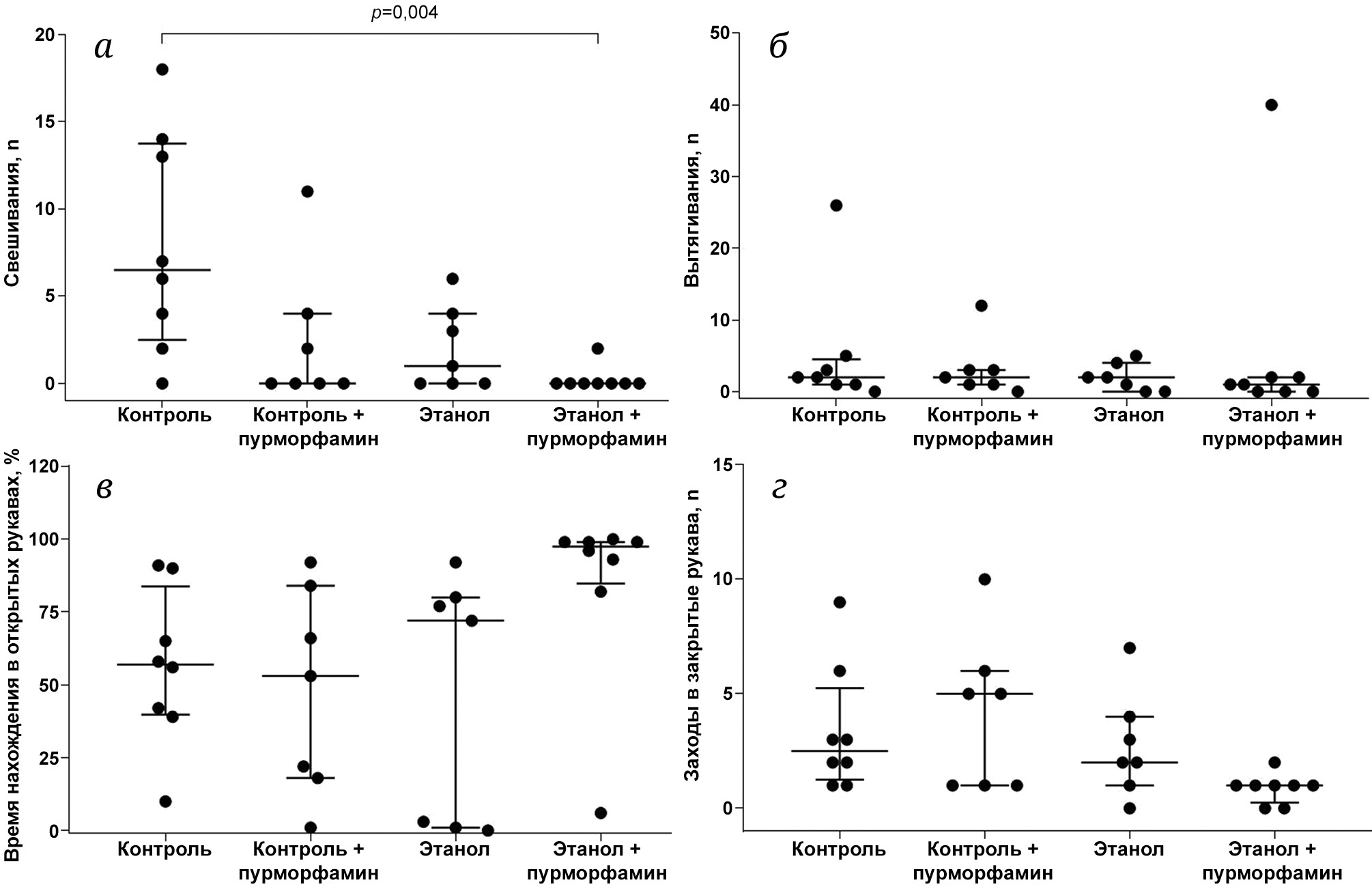 Поведение в приподнятом крестообразном лабиринте. Через двое суток после отмены алкоголя оценивали поведение в тесте «Приподнятый крестообразный лабиринт» (рис. 5). Согласно ранговому критерию Краскела–Уоллиса, экспериментальные группы различались по числу свешиваний (рис. 5, а; H(3,30) = 11,800; p = 0,008), времени нахождения в открытых рукавах (рис. 5, в; H(3,30) = 9,440; p = 0,024), числу заходов в закрытые рукава (рис. 5, г; H(3,30) = 8,121; p = 0,044), но не числу заходов в открытые рукава (данные не представлены; H(3,30) = 1,985; p = 0,576) и числу вытягиваний (рис. 5, б; H(3,30) = 1,604; p = 0,659). Последующий post hoc анализ множественных сравнений с помощью теста Данна показал, что число свешиваний в группе «Этанол + пурморфамин» было значимо ниже по сравнению с группой «Контроль» (рис. 5, а). Кроме того, в группе «Этанол + пурморфамин» наблюдалась тенденция (p < 0,1) к увеличению времени нахождения в открытых рукавах лабиринта по сравнению с группами «Контроль + пурморфамин» (p = 0,084) и «Этанол» (p = 0,053; рис. 5, в), а также снижения числа заходов в закрытые рукава лабиринта по сравнению группами «Контроль» (p = 0,088) и «Контроль + пурморфамин» (p = 0,095; рис. 5, г). Пройденная дистанция и скорость передвижения в приподнятом крестообразном лабиринте не различались между экспериментальными группами (данные не представлены).
