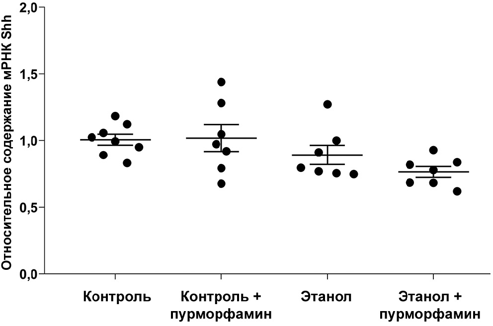 Каскад Hh и потребление алкоголя. Вовлеченность Hh в механизмы потребления алкоголя и развития нарушений, сопутствующих хронической интоксикации в зрелом возрасте, не изучена. В настоящей работе впервые была проведена оценка влияния пурморфамина на потребление алкоголя половозрелыми крысами в условиях свободного выбора. Согласно полученным результатам, пурморфамин не оказывал значимого эффекта на предпочтение этанола воде. Тем не менее в этом контексте необходимо упомянуть данные литературы относительно эффективности пурморфамина в модели обсцессивно-компульсивного расстройства, которое может быть связано с формированием патологических форм потребления алкоголя. В частности, было продемонстрировано, что поведение, подобное обсцессивно-компульсивному, вызванное введением агониста серотониновых рецепторов 1А-подтипа в ядра шва, ослаблялось при системном введении пурморфамина [22]. Помимо прочего, в этой модели наблюдали снижение уровня Shh в цереброспинальной жидкости, плазме крови и ткани мозга, при этом пурморфамин, сам по себе не влияя на содержание Shh, нормализовал его уровень [22].