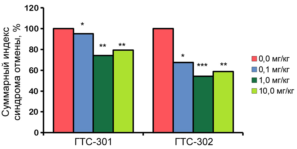 В целом, ГТС-301 и ГТС-302 ослабляли 7 из 18 анализируемых признаков СО морфина, при этом наибольшее снижение суммарного индекса СО (41,1%) наблюдалось у ГТС-302 в дозе 1,0 мг/кг (табл. 3).