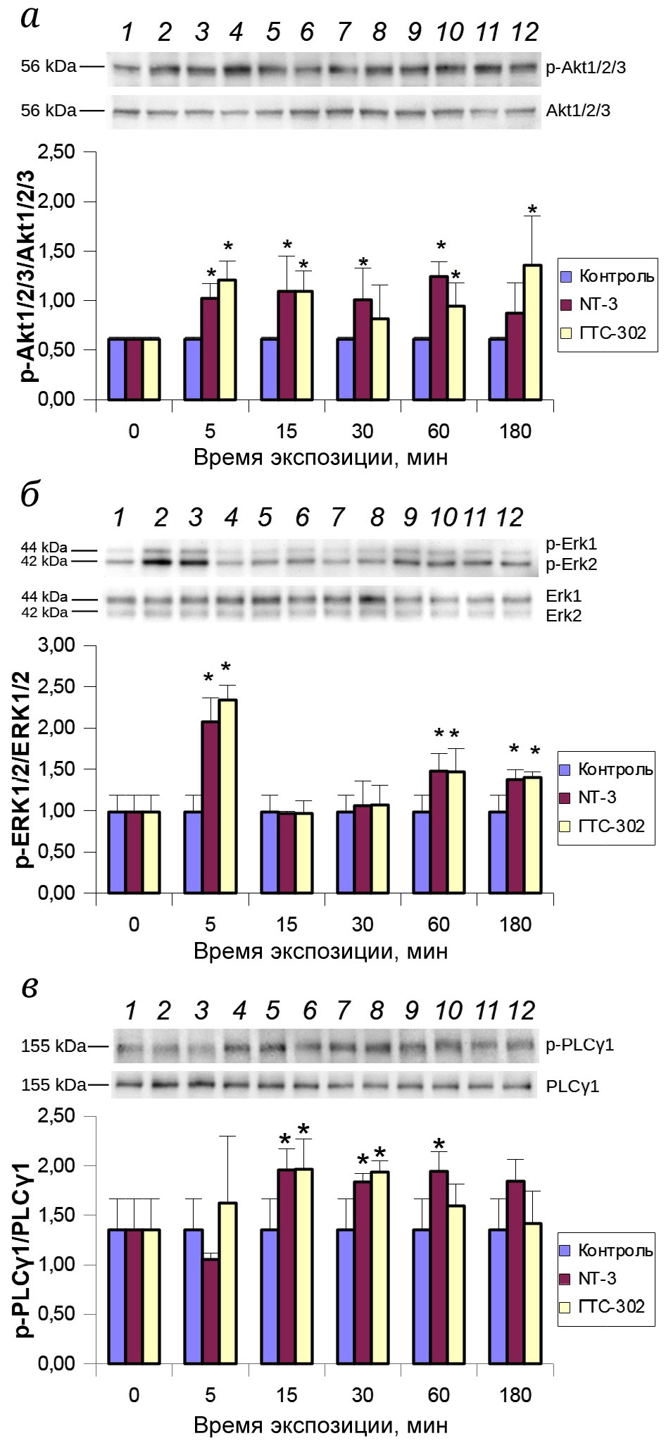 Вестерн-блот-анализ. Пробы лизировали в 50 мМ Tris-HCl (pH 7,5), содержащем 5 мМ ЭДТА, 1 мМ дитиотреитола, 1% (w/v) Triton Х-100, через 5, 15, 30, 60 и 180 мин после внесения NT-3 (10−9 М) («Sigma», США), или ГТС-301 (L,L) (10−6 М), или ГТС-302 (L,L) (10−6 М). NT-3 (10−9 М) использовали в качестве положительного контроля. Нефосфорилированные протеинкиназы B (AKT), киназы, регулируемые внеклеточными сигналами (ERK1/ERK2) и фосфолипаза C (PLCγ1) были использованы в качестве контроля загрузки. Содержание белков исследовали в цитозольной фракции. Концентрацию белка в образцах измеряли по методу Фолина–Лоури [15]. На дорожку в геле наносили 75 мкг белка. Белки разделяли электрофорезом в 10%-ном полиакриламидном геле с использованием электрофоретической системы Mini-Protean Tetra Cell («Bio-Rad», США) [16]. Далее, белки переносили на мембрану PVDF («Santa Cruz», США) в системе для переноса Trans-Blot Turbo («Bio-Rad»). Преинкубацию всех вестерн-блотов проводили в буфере TBS-T (20 мМ Tris-HCl, 137 мМ NaCl, 1% (v/v) Tween 20; pH = 7,5), содержащем 3% (w/v) BSA («Bio-Rad»), в течение 1 ч с использованием первичных антител anti-p-AKT (#PA5-104445; «Invitrogen, ThermoFisher», США), anti-p-ERK1/ERK2 (#PA5-37828; «Invitrogen, ThermoFisher»), anti-p-PLCγ1 (#2821S; «Cell Signaling Technology», США), против AKT (#PA5-77855; «Invitrogen, ThermoFisher»), ERK1/ERK2 (#61-7400; «Invitrogen, ThermoFisher») и PLCγ1 (#2822S; «Cell Signaling Technology») в разведении 1 : 1000 в течение ночи при +4 °С. Затем, после отмывки в буфере TBS-T, содержащем 0,05% (w/v) BSA, мембраны инкубировали в присутствии вторичных антител goat anti-rabbit IgG (#31460; «Thermo Fisher Scientific»), конъюгированных с пероксидазой хрена (разведение 1 : 1000) в течение 1 ч. Детектирование белков осуществляли после отмывки от вторичных антител в буфере с ECL-реагентами (#32106; Pierce ECL WB Substrate («ThermoFisher», США)) c использованием гель-документирующей системы Alliance («UVITEC», Великобритания). Денситометрию полученных изображений проводили с помощью программы GIMP2.