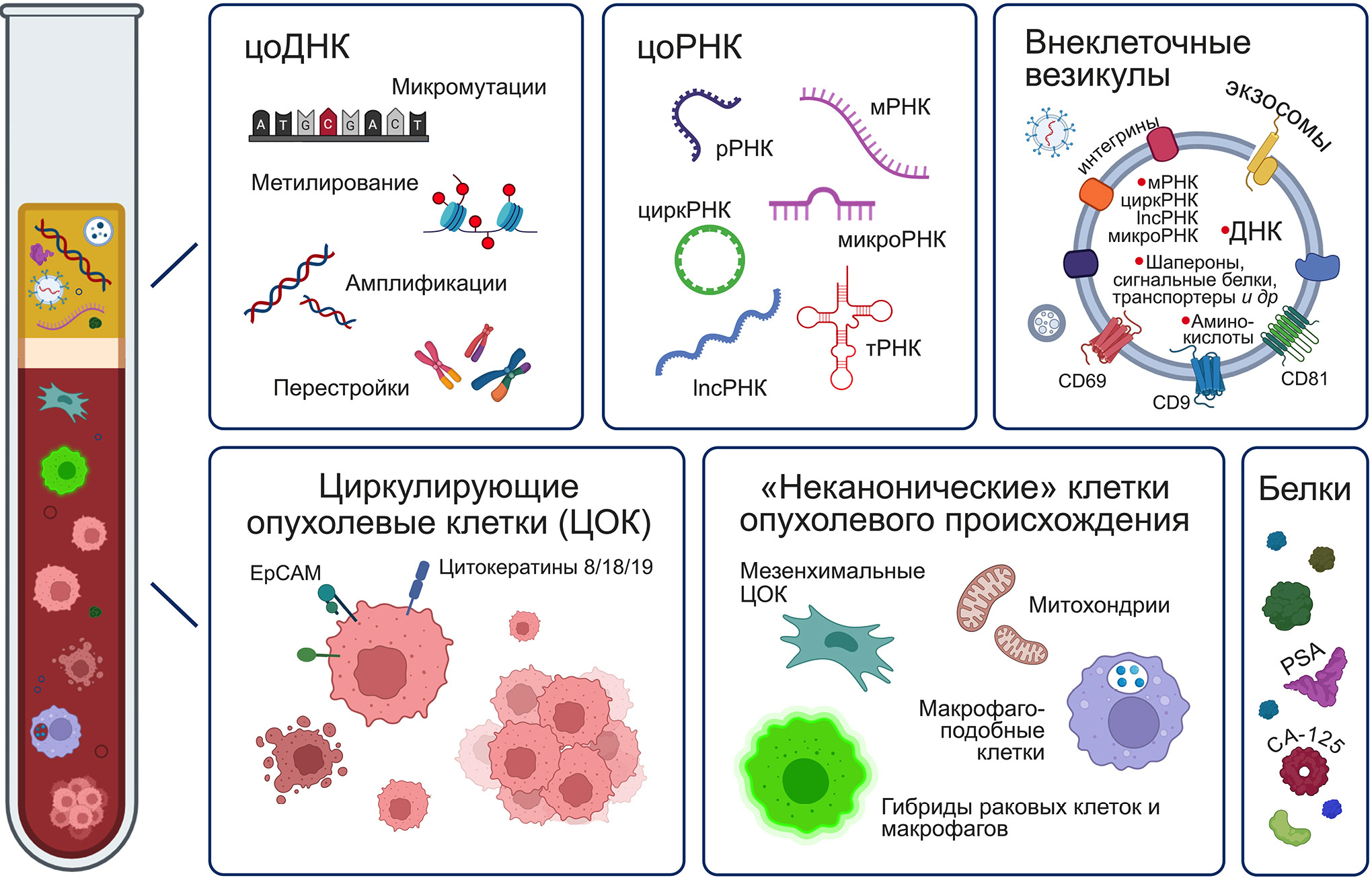 Принятые сокращения: BB – внеклеточные везикулы; ЖБ – жидкостная биопсия; РЖ – рак желудка; РЛ – рак лёгкого; РМЖ – рак молочной железы; РП – рак простаты; РПЖ – рак поджелудочной железы; РТК – рак толстой кишки; РЯ – рак яичника; цоДНК – циркулирующая опухолевая ДНК; ЦОК – циркулирующие опухолевые клетки; CA-125 – раковый антиген-125; PSA – prostate-specific antigen, простатический специфический антиген.