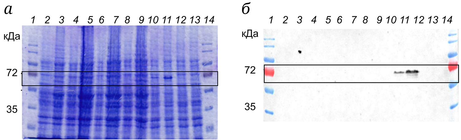 Рис. 1. Анализ экспрессии His-tag-Sam68 в лизате различных штаммов-продуцентов методом денатурирующего гель-электрофореза в 10%-ном Ds-Na-ПААГ с последующим окрашиванием Кумасси R-250 (а) или методом вестерн-блота (б). Дорожки: 1 и 14 – маркер молекулярных масс («Bio-Rad», США); 2 и 3 – штамм BL21(DE3) до и после индукции; 4 и 5 – штамм BL21(DE3)GeneX до и после индукции; 6 и 7 – штамм BL21(DE3)pLysS до и после индукции; 8 и 9 – штамм Rosetta(DE3) до и после индукции; 10 и 11 – штамм Rosetta(DE3)pLysS до и после индукции; 12 и 13 – штамм Rosetta(DE3)GamiB до и после индукции