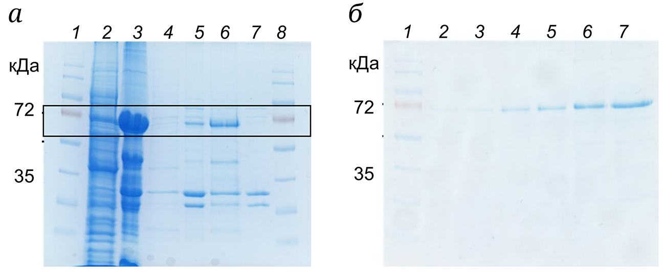 3. Рис. 2. При экспрессии в клетках E. coli Sam68 накапливается в виде телец включения. а – Анализ содержания His-tag-Sam68 в растворимой и нерастворимой фракциях методом денатурирующего гель-электрофореза в 10%-ном Ds-Na-ПААГ с последующим окрашиванием Кумасси R-250. Дорожки: 1 и 8 – маркер молекулярных масс («Bio-Rad»); 2 – растворимая фракция после центрифугирования лизированных клеток; 3 – лизат штамма продуцента Rosetta(DE3)pLysS; 4 – растворимая фракция в 1 М мочевине после центрифугирования лизированных клеток; 5 – нерастворимая фракция; 6 – растворимая фракция в 8 М мочевине; 7 – нерастворимая фракция после обработки лизата клеток 8 М мочевиной. б – Анализ содержания белка после хроматографии на колонке с Ni-NTA. Дорожки: 1 – маркер молекулярных масс; 2 – 0,1 мкг; 3 – 0,2 мкг; 4 – 0,3 мкг; 5 – 0,4 мкг; 6 – 0,5 мкг; 7 – 1 мкг белка, полученные после элюции с Ni-NTA
