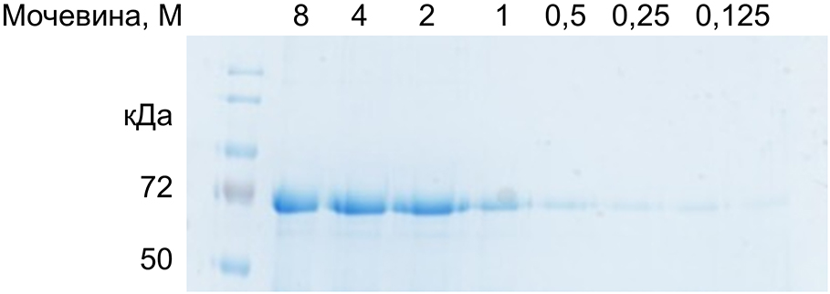 Рис. 3. Анализ растворимости Sam68 в мочевине методом денатурирующего гель-электрофореза в 10%-ном Ds-Na-ПААГ с последующим окрашиванием Кумасси R-250. Реакционные смеси содержали 50 мМ Tris-HCl (pH 8,0), 200 мМ NaCl, 0,1% NP-40, 7 мМ 2-меркаптоэтанола, 1 мкМ Sam68 и мочевину в соответствующей концентрации (125 мМ–8 М)