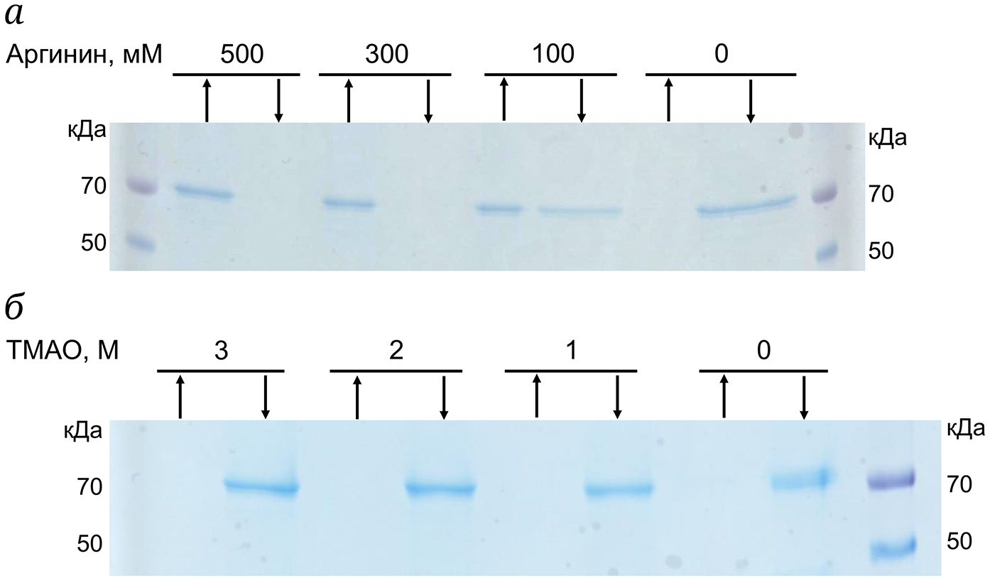 Рис. 4. Анализ растворимости Sam68 при низкой концентрации мочевины (150 мМ) в присутствии аргинина (а) или TMAO (б) методом денатурирующего гель-электрофореза в 10%-ном Ds-Na-ПААГ с последующим окрашиванием Кумасси R-250. Реакционная смесь содержала 20 мМ Tris-HCl (pH 8,0), 100 мМ NaCl, 0,1% NP-40, 1 мМ ДТТ, 150 мМ мочевины, 1 мкМ Sam68 и аргинин/ТМАО в указанной концентрации. Анализировали растворимую фракцию (↑) и осадок (↓)