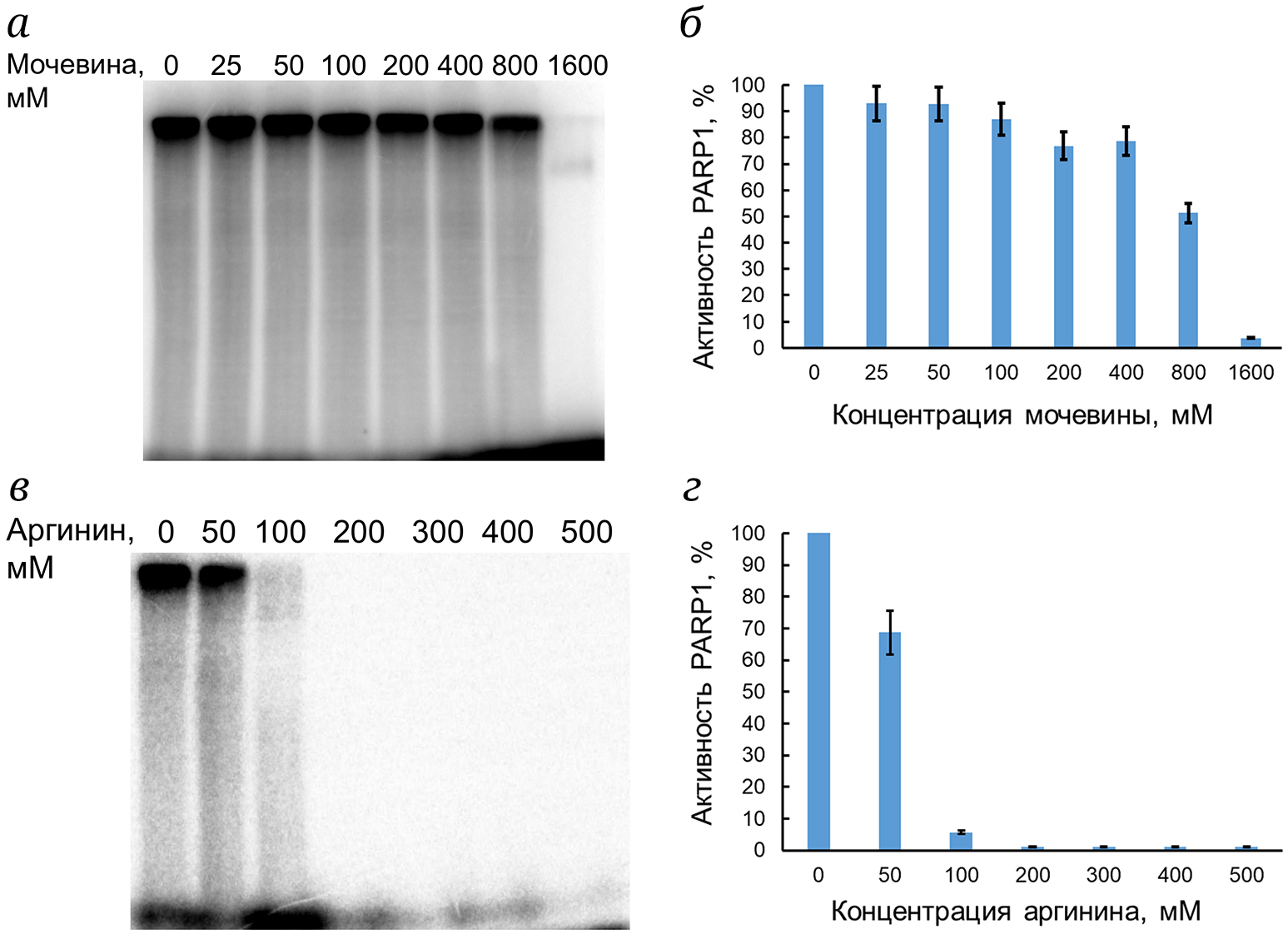 Рис. 5. Влияние мочевины (а и б) и аргинина (в и г) на каталитическую активность PARP1. а – Радиоавтограф 10%-ного Ds-Na-ПААГ, в котором проводили разделение продуктов реакции PAR-илирования в присутствии мочевины. б – Диаграмма, построенная после анализа распределения радиоактивности в геле, представленном на панели (а). Активность PARP1 при отсутствии мочевины принята за 100%. в – Радиоавтограф 10%-ного Ds-Na-ПААГ, в котором проводили разделение продуктов реакции PAR-илирования в присутствии аргинина. г – Диаграмма, построенная после анализа распределения радиоактивности в геле, представленном на панели (в). Активность PARP1 при отсутствии аргинина принята за 100%