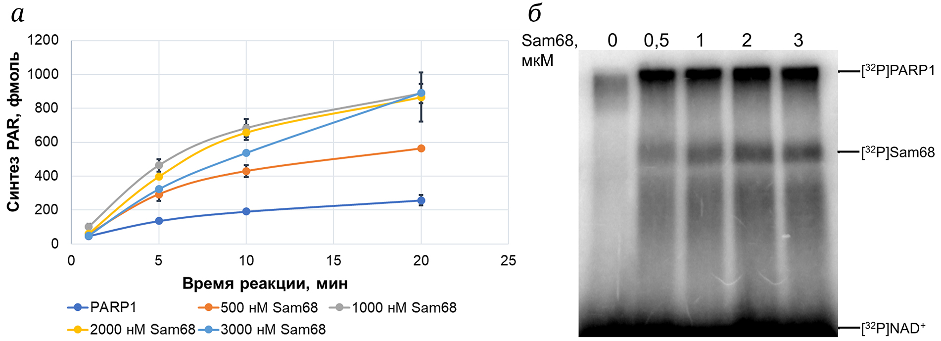 Рис. 6. Sam68 стимулирует активность PARP1. а – Кинетика уровня синтеза PAR в присутствии различных концентраций Sam68. Pеакцию синтеза PAR проводили с использованием [32P]NAD+ и останавливали перенесением аликвот реакционной смеси на бумажный фильтр Whatman, пропитанный ТХУ. На графиках приведены средние значения ± стандартные отклонения для трех независимых экспериментов. б – Анализ авто-PAR-илирования PARP1 и транс-PAR-илирования Sam68 методом денатурирующего гель-электрофореза. Радиоавтограф 10%-ного Ds-Na-ПААГ, в котором проводили разделение продуктов реакции PAR-илирования белков