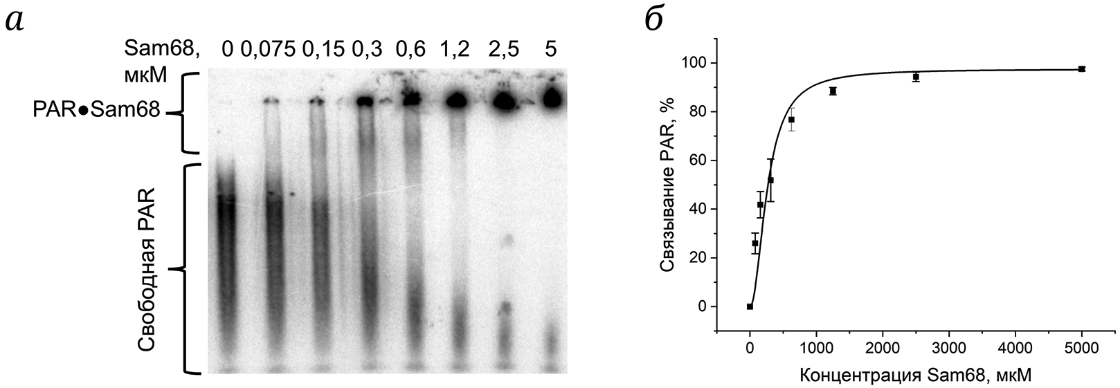 Связывание Sam68 с PAR анализировали методом задержки в геле. Реакционные смеси, содержащие 50 мМ Tris-HCl (pH 8,0), 40 мМ NaCl, 1 мМ ДТТ, 100 мкг/мл БСА, 500 мМ мочевины, 10 нМ [32P]-меченой PAR, 0–5 мкМ Sam68, инкубировали при 37 °С в течение 5 мин. Затем в реакционные смеси добавляли буфер нанесения, содержащий 20 мМ Tris-HCl (pH 7,5), 25% глицерина, 0,01% бромфенолового синего, и проводили электрофорез в неденатурирующих условиях в 5%-ном ПААГ при 4 °С с последующей радиоавтографией.