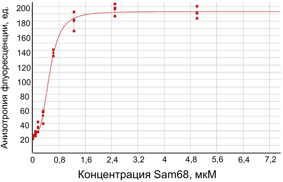 Исследование взаимодействия Sam68 с ДНК и PAR. Связывание белков с поврежденной ДНК детектировали по изменению анизотропии флуоресценции FAM-меченой ДНК (FAM-Nick), содержащей одноцепочечный разрыв [19]. Реакционные смеси, содержащие 50 мМ Tris-HCl (pH 8,0), 40 мМ NaCl, 1 мМ ДТТ, 100 мкг/мл БСА, 0,5 М мочевины, 0–5 мкМ Sam68, 100 нМ PARP1 и 10 нМ ДНК (FAM-Nick), инкубировали при комнатной температуре в течение 5 мин. Измерения интенсивности флуоресценции образцов проводили в 384-луночном планшете («Corning», США) с использованием микропланшетного флуориметра CLARIOstar («GMBLabtech GmbH», Германия). Количественную обработку экспериментальных данных выполняли в программе MARS Data analysis («GMB LabtechGmbH», Германия) [19]. Зависимость изменения анизотропии флуоресценции от концентрации белка была обработана с использованием уравнения (4):