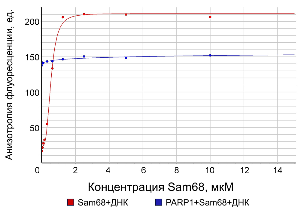 При последовательном увеличении концентрации Sam68 при отсутствии PARP1 наблюдается увеличение уровня анизотропии флуоресценции (рис. 9, красная линия), что свидетельствует о том, что происходит формирование комплекса Sam68 с поврежденной ДНК. При добавлении Sam68 к предварительно сформированному комплексу PARP1•ДНК не наблюдалось значительного увеличения уровня анизотропии флуоресценции (рис. 9, синяя линия), что указывает на то, что формирования тройного комплекса Sam68•PARP1•ДНК не происходит.