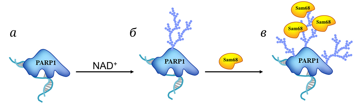 В недавних исследованиях было показано, что внутренне неупорядоченный РНК-связывающий белок Sam68, содержащий домен KH и ассоциированный с сигнальной трансдукцией (Src-associated substrate during mitosis of 68 kDa) способен регулировать синтез PAR ферментом PARP1, модулируя уровень синтеза этого полимера как в системе in vitro, так и в системе ex vivo [15]. Было показано, что в клетках, нокаутных по гену Sam68, наблюдался более низкий уровень синтеза PAR после повреждения клеток γ-облучением [15]. Масс-спектрометрическими методами Sam68 был идентифицирован как мишень PAR-илирования в клетке [16]. Однако, несмотря на то что для Sam68 была показана важная роль в регуляции активности PARP1 при генотоксическом стрессе, детальный механизм влияния Sam68 на синтез PAR не был установлен.