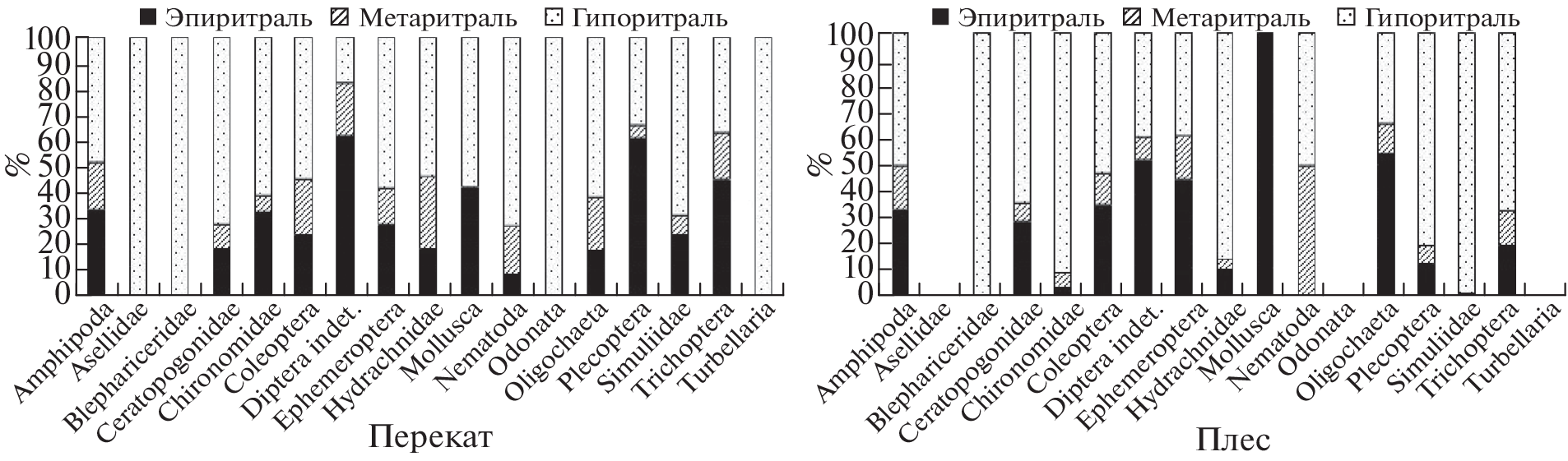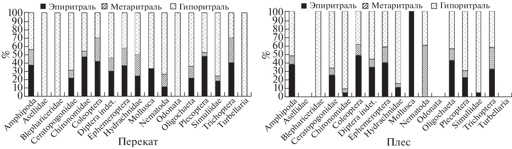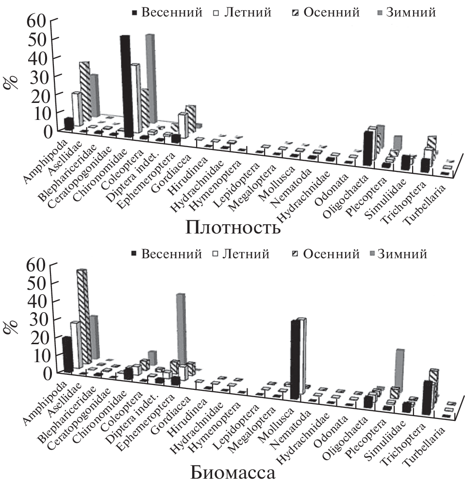 The results of long-term studies are used to present, for the first time, the structural organization of zoobenthos communities and the dynamics of their density and biomass in rivers and brooks of the the Khektsir Ridge, including the boundaries of the Bol’shekhekhtsirskii Reserve, Khektsirskii Wildlife Reserve (the southern part of the Russian Far East). The benthic organisms were found to contain 23 groups (22 groups in the spring and summer, 19 groups in the autumn, and 8 groups in the winter). Leading in the occurrence frequency (>90%) were chironomids, mayflies, and oligochaetes. The chironomids and amphipods accounted for 37.0 and 19.1% of the total benthos density, and mollusks and amphipods, for 32.1 and 29.7% of the total biomass, respectively. Dominants in terms of density and biomass were amphipods; chironomids dominated in terms of density, and mollusks, in terms of biomass. The mean density of benthic organisms was 637 ± 21 spec./m2, and the mean biomass was 1.8 ± 0.2 g/m2. The benthic communities of rift segments in the rithral zone were found to be most productive. It is shown that the seasonal and long-term dynamics of zoobenthos communities is pronounced and can be traced in the group composition, structure, and quantitative characteristics.