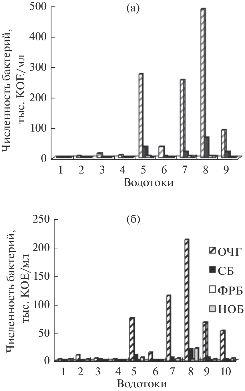 The distribution of organic matter, hydrocarbons, phytopigments, and ecological-trophic groups of microorganisms was studied in the bottom sediments of ten small tributaries of the Amur R. near Khabarovsk. The water showed high concentrations of organic matter, varying from 44.47 to 279.3 mg/L. The concentration of Corg in bottom sediments varied from 1.9 to 23.1% in different types of sediments; the amount of hydrocarbons reached 5081 mg/kg, exceeding the background level by a factor of up to 50. Studies of the molecular composition of hydrocarbons in sediments revealed in some streams the predominance (up to 100% of the total) of light (C8–C13) n-alkanes, typical of oil products and the products of vegetation combustion. High-molecular compounds dominated in HC composition in most watercourses, including n-alkanes, genetically associated with terrestrial vegetation, and heavy fractions of oil products with various levels of microbial degradation. Volatile organic compounds were quantitatively dominated by the products of microbiological transformation (acetaldehyde and methanol). In terms of the concentration of sedimentary pigments (up to 400 µg/g), the sediments of the majority of watercourses belong to the hypereutrophic type. The total abundance of microorganisms in water varied from 2.7 to 488.0 thousand CFU/mL; in sediments, it was distributed symbatically, but ranged from 0.1 to 19.3 million CFU/g. The number of heterotrophic bacteria in bottom sediments correlated with the parameter of overload of the self-purification capacity (r = 0.718), and the number of oil-oxidizing bacteria correlated with hydrocarbon concentration (r = 0.967), thus confirming the indication properties of this bacterial group.