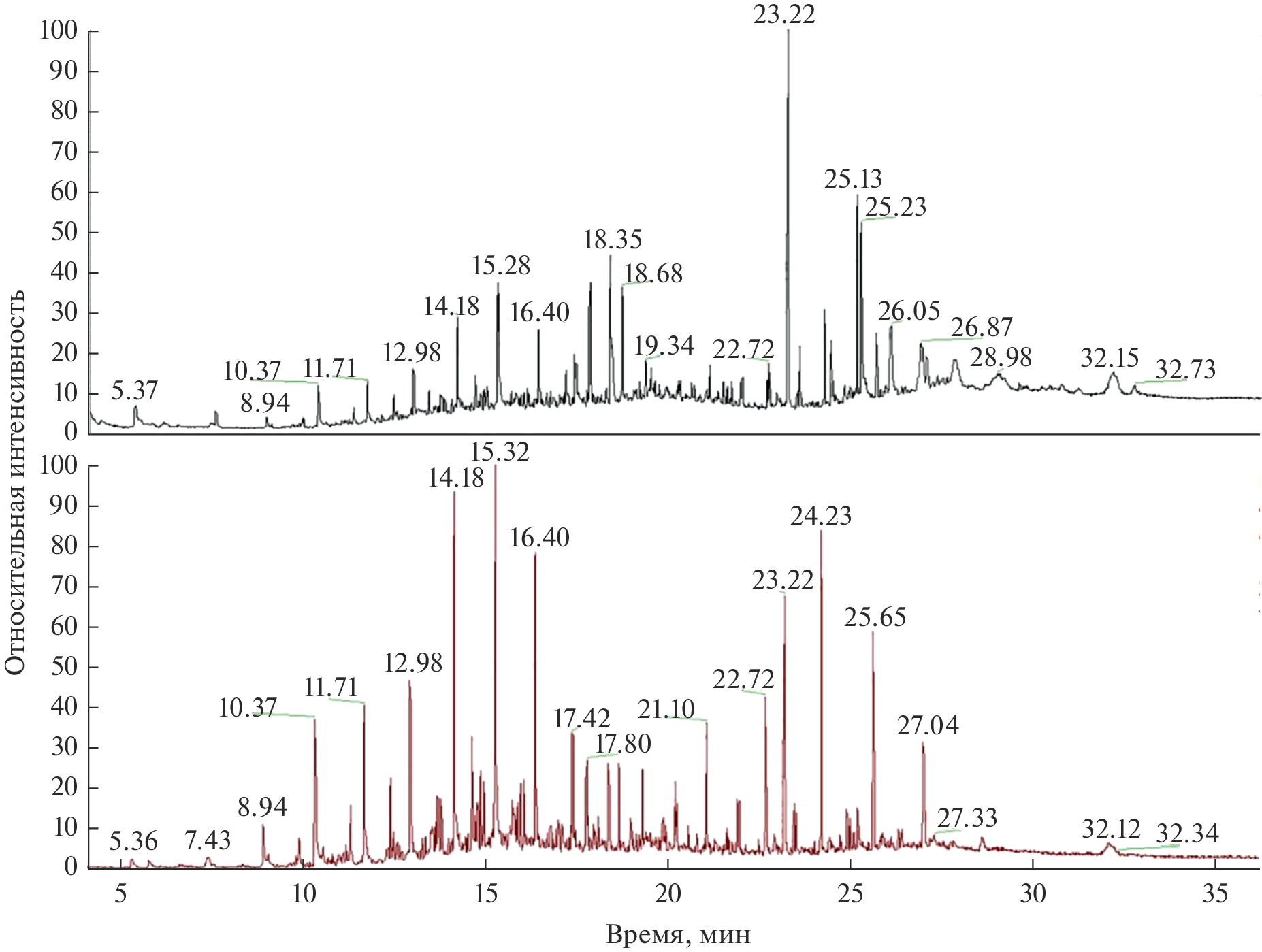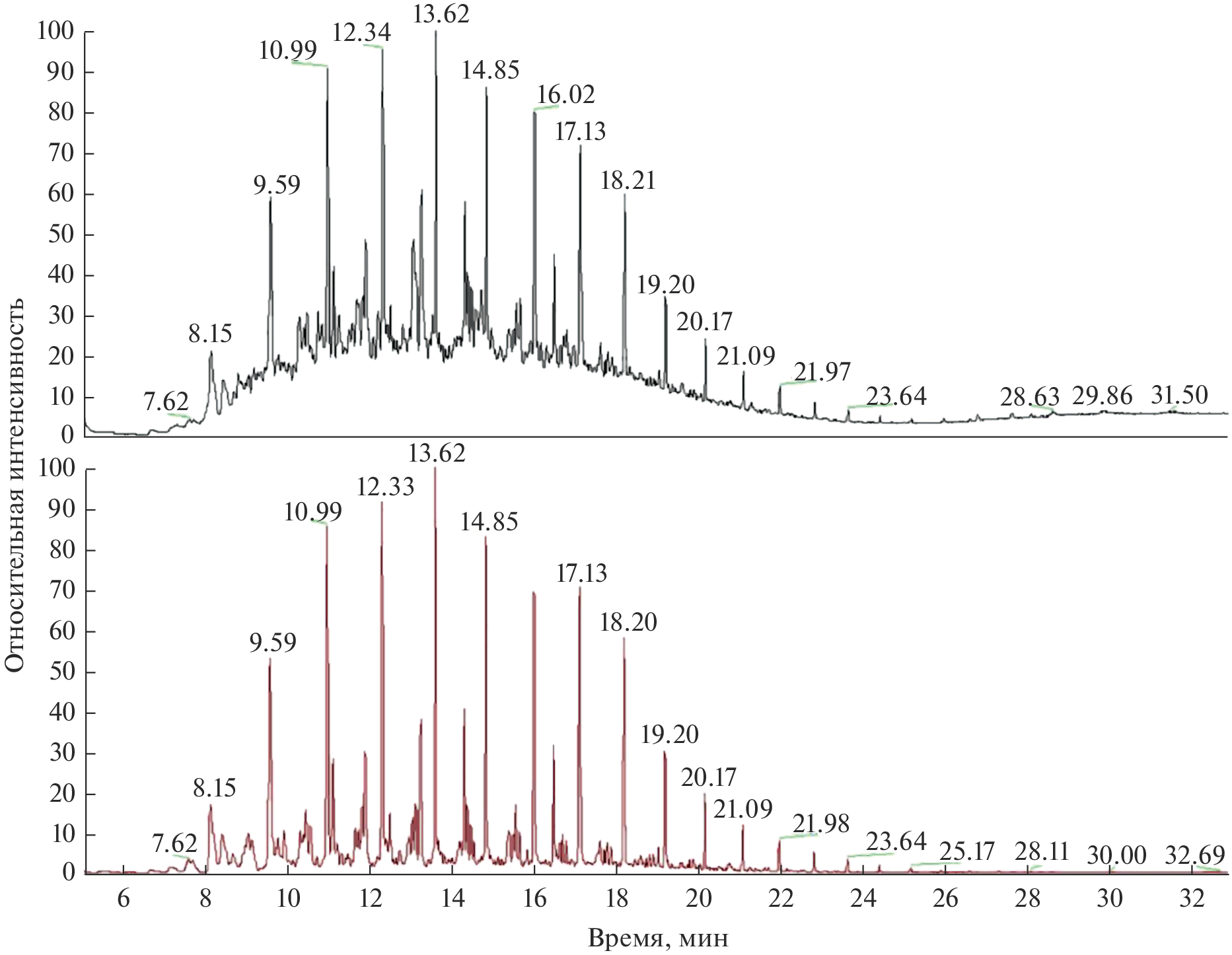 Обычно применяемые интегральные методы определения нефтепродуктов, такие как гравиметрический, ИК-фотометрический, флуоресцентный, не учитывают природу определяемых соединений и вклад биогенных углеводородов, для суждения о которых необходим более детальный анализ, который можно осуществить методом ГХ/МС. Для нефтепродуктов в донных отложениях оз. Пясино характерно наличие н-алканов со значительным преобладанием н-алкана С17 и небольшим преобладанием н-С12, н-С14, н-С16 и н-С18, свидетельствующими о вкладе микроорганизмов и водорослей, а также с преобладанием С23, С25, С27, С29, С31, обусловленным вкладом наземных высших растений. На хроматограмме имеются два максимума неразделенных соединений в областях С10–С21 и С22–С33. Нефтепродукты в них представляют собой смесь алканов, циклоалканов с 1–4 кольцами в конденсированной системе и ароматических и нафтено-ароматических углеводородов с 1–3 бензольными и 1–2 насыщенными кольцами в конденсированной системе, с алкильными заместителями, содержащими 0–12 (преимущественно 2–8) атомов С.