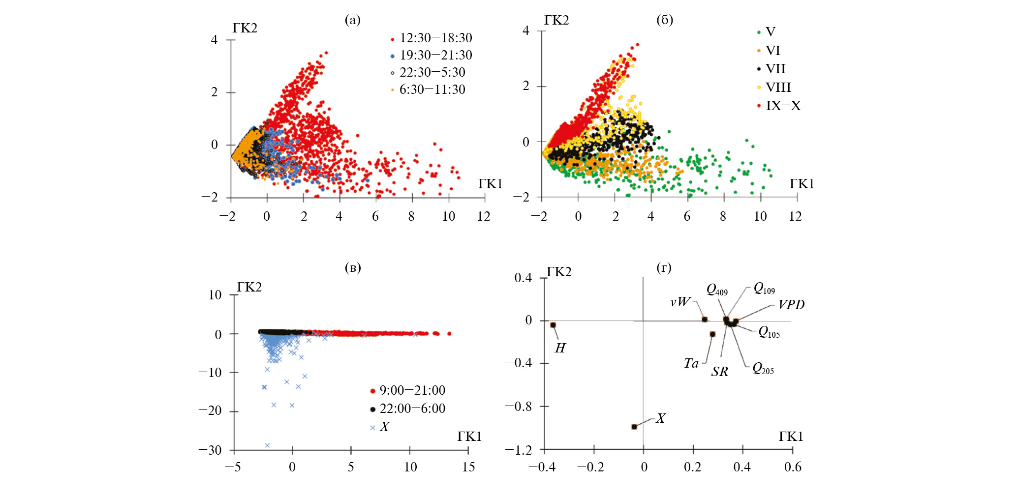 График счетов ГК1‒ГК2 (рис. 4а, 4б), представляющий собой проекции всех измерений в новой системе координат, демонстрирует наличие внутрисуточных и сезонных колебаний. ГК1 отвечает за внутрисуточный цикл (рис. 4а): данные измерений, выполненных в дневные и вечерние часы, находятся преимущественно в области положительных значений по ГК1, а ночные и утренние – в области отрицательных.