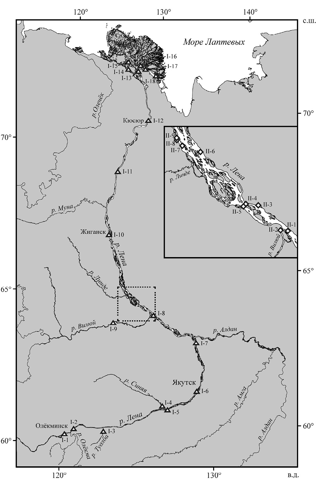 Рис. 1. Расположение точек отбора проб воды в нижнем течении р. Лены в 1995 (I-1–I-18) и 2021 (II-1–II-9) гг.