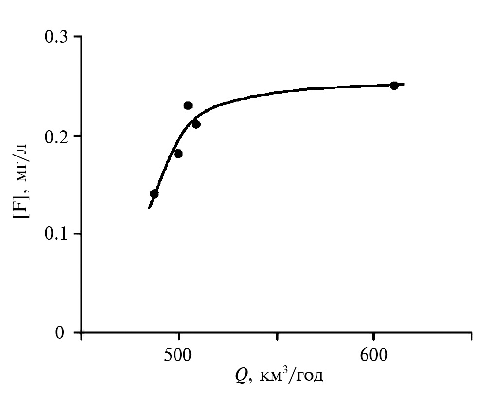 Остаются неясными причины повышенного содержания фтора в водах р. Лены по результатам систематических наблюдений в 1954–1976 гг. (табл. 2). В связи с этим обратим внимание на один факт, связанный с методикой колориметрического определения фтора, которая была использована в работах [7–9]. Для указанного временного периода наблюдается возрастание концентрации фтора при увеличении объема годового водного стока (рис. 3), что свойственно не растворенным компонентам, а взвешенным веществам, тогда как содержание растворенных компонентов при увеличении водного стока, как правило, снижается [2]. До разработки фторидного ионоселективного электрода в 1968 г. и его широкого внедрения в практику гидрохимических исследований для определения фтора в природных водах использовали колориметрические методы, в которых пробы воды подвергаются сильному подкислению. Присутствующие в анализируемых пробах воды в кислой среде даже в небольшом количестве тонкие взвеси, не задерживаемые бумажными фильтрами, частично растворяются, и содержащийся в них фтор переходит в раствор. При низких концентрациях растворенного фтора это может приводить к существенному завышению результатов колориметрических анализов [13].