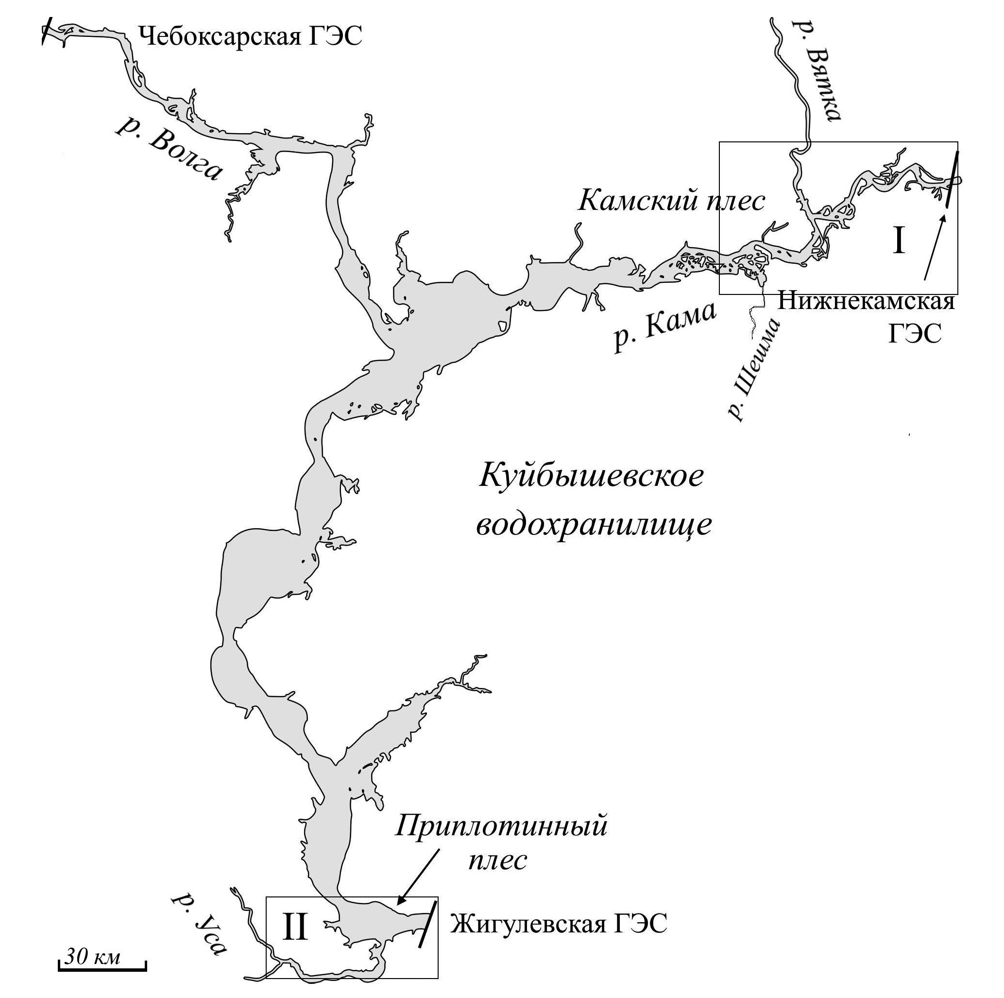 Куйбышевское водохранилище, самое крупное долинное водохранилище в Волжско-Камском каскаде, испытывает на себе влияние сразу трех плотин (ГЭС): Чебоксарской, Нижнекамской и Жигулевской (рис. 1). Верхний участок водохранилища (по его Камскому плесу) совпадает с нижним бьефом Нижнекамской ГЭС, а нижний участок (Приплотинный плес) – с верхним бьефом Жигулевской ГЭС. На обоих участках по правому берегу впадают притоки – реки Вятка и Уса. При этом устьевая зона р. Вятки относится к простому типу, а р. Усы – к эстуарному [18], располагаются они в нижнем и верхнем бьефах разных плотин соответственно (рис. 1).