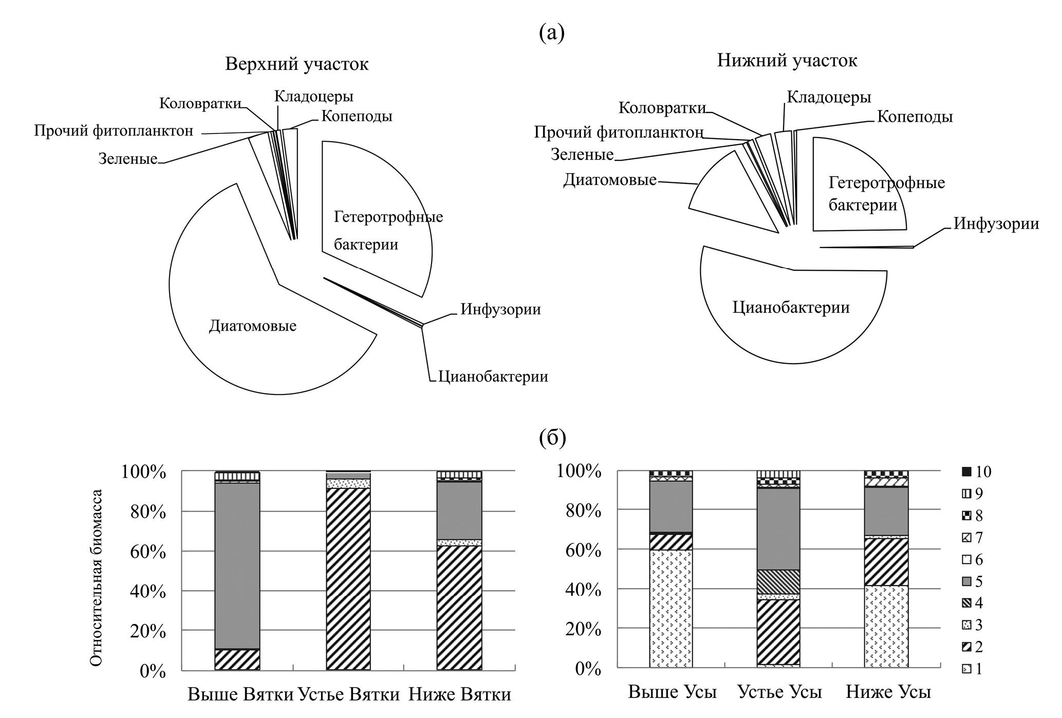 Абсолютная биомасса планктона в водохранилище выше впадения притоков была ниже, чем после впадения. Так, после слияния с р. Вяткой суммарная биомасса увеличилась в 5.2 раза, а после впадения р. Усы – в 2.2 раза (если учитывать только прилегающие к устьевой зоне станции). И Вятка, и Уса, несущие значительное количество диатомовых в составе планктона, способствуют увеличению вклада последних в его биомассу после впадения притоков в водохранилище: с 10 до 62% в Камском Плесе и с 8 до 21% в Приплотинном плесе (рис. 2б). Вклад гетеротрофных бактерий, напротив, уменьшается с 83 до 29% и с 26 до 21% соответственно. Кроме того, непосредственно в зоне слияния с р. Усой (рис. 2б) и в целом по акватории после места слияния с притоком уменьшается роль цианобактерий в формировании планктона (рис. 2б). О более значимом влиянии р. Вятки по сравнению с р. Усой свидетельствуют и разные соотношения компонентов планктона с учетом притока и без него (табл. 3).