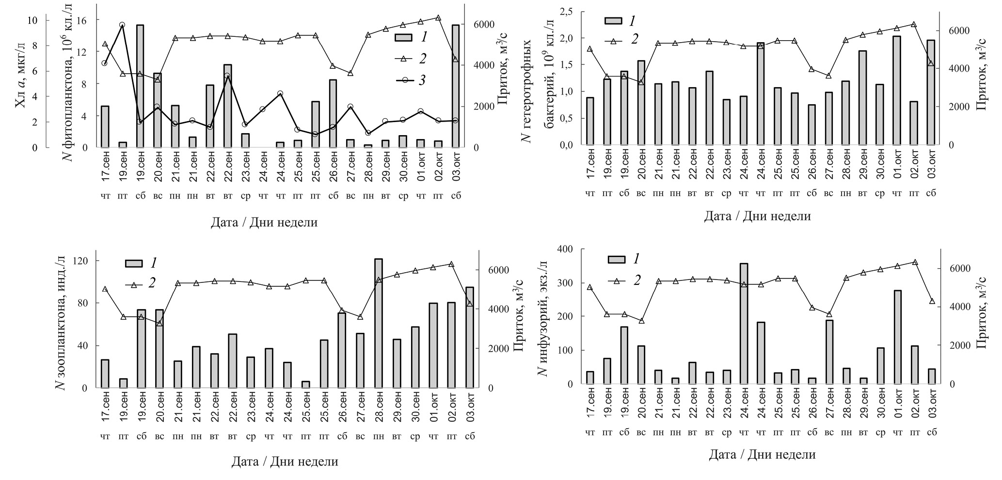 При кажущейся хаотичности колебаний численности отдельных компонентов планктона в периоды снижения суточного притока воды (выходные дни), как правило, регистрируется некоторое ее увеличение для большинства компонентов планктона. Наименее выражено это влияние для бактерий, а наиболее – для фитопланктона (рис. 3). Аналогичная закономерность отмечалась для планктонных инфузорий в августе 2012 г. [4]. Дополнительные пики численности отдельных компонентов обусловлены локальными условиями и приурочены, например, к местам повышенной антропогенной нагрузки или впадения притоков (рис. 3). Интересно отметить, что с уровнем суточного притока воды концентрация Хл а связана в значительно меньшей степени (r = –0.32), чем численность фитопланктона (r = –0.48), поскольку концентрация Хл а зависит не только от численности фитопланктона, но и от его структуры. Ранее аналогичная и даже более выраженная зависимость между концентрацией Хл а и динамикой суточной приточности (r = –0.62) отмечалась ниже Жигулевской ГЭС в Саратовском водохранилище в летний период в условиях массового цветения цианобактериями [21].