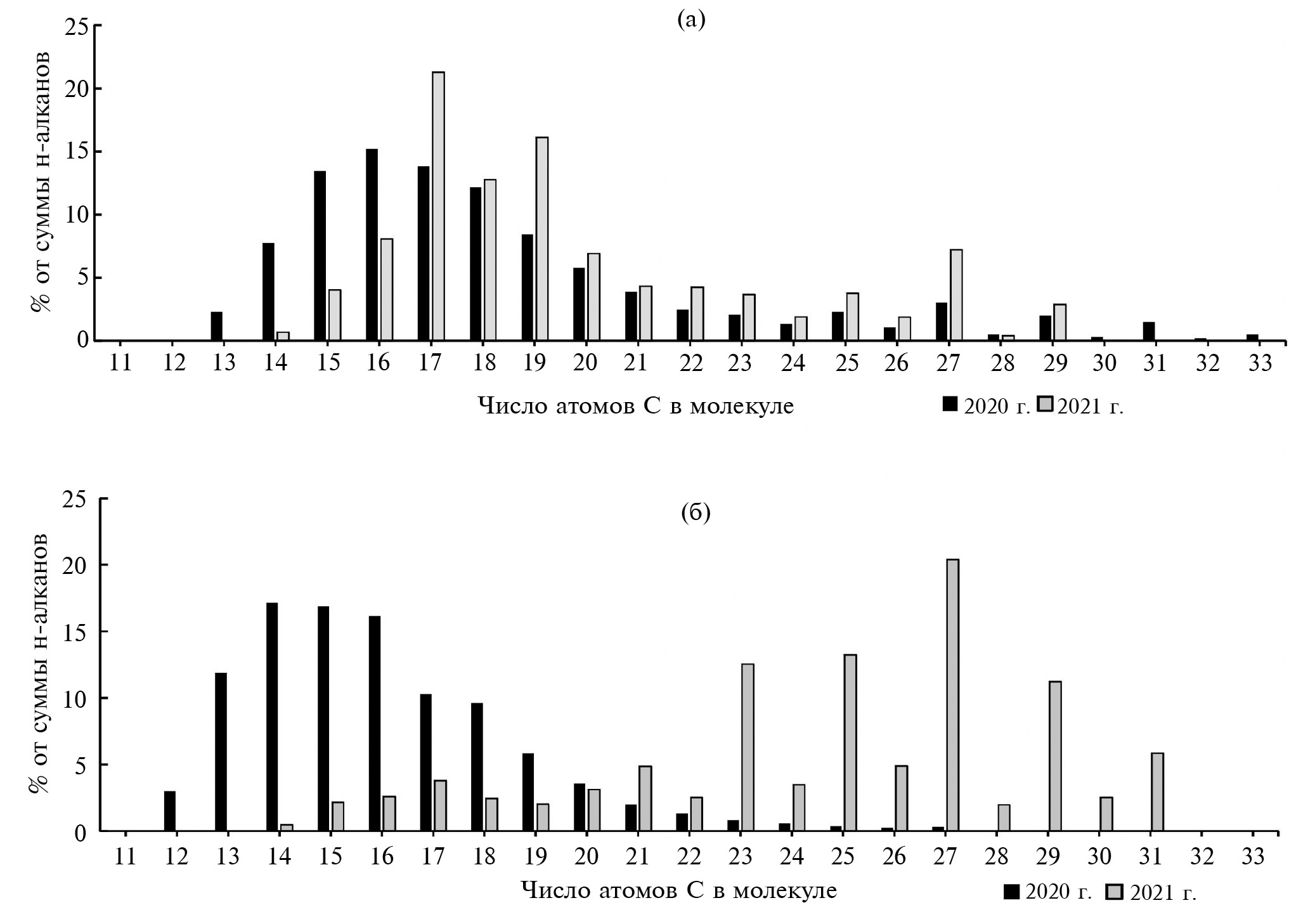 Рис. 4. Состав алканов в поверхностном слое ДО на станциях N5 (а) и N11 (б) в 2020 и 2021 гг. Расположение станций приведено на рис. 1.