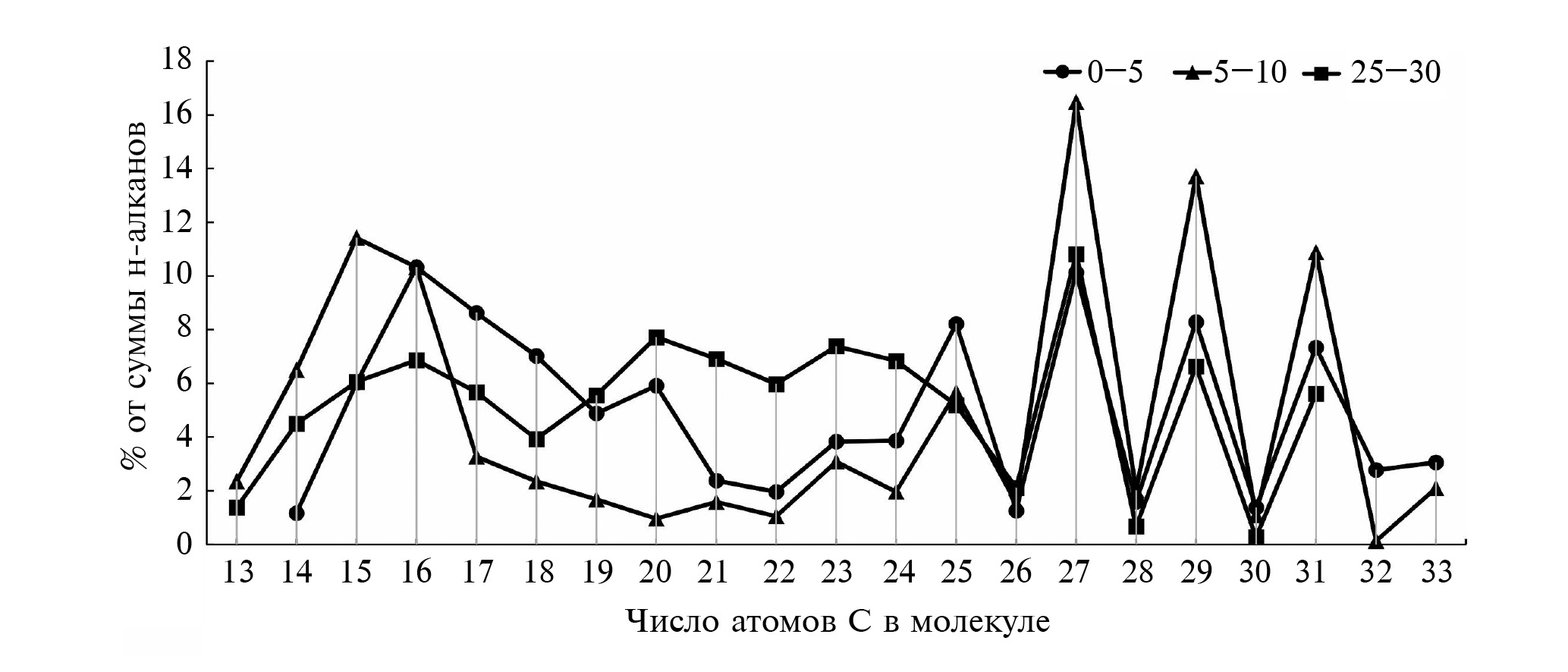 В ДО изменялся состав алканов (табл. 2; рис. 7): возросло количество автохтонных алканов н-С15 (горизонт 3–10 см) и н-С16 (горизонт 25–30 см). Содержание изо-соединений здесь возросло в 3.5 раза (до 53.02%) за счет уменьшения н-гомологов в 3.9 раз (до 19.45%). При этом возрос коэффициент Ki в 19.1 раз (до 24.17).
