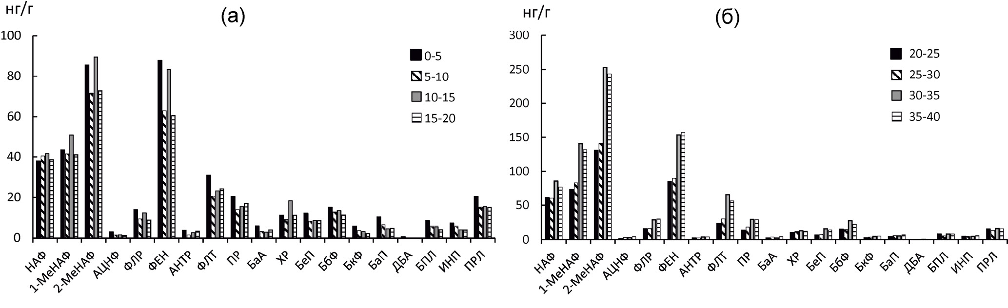Если в 2020 г. максимально загрязненными УВ оказались верхние слои ДО [13], то в 2021 г. нефтепродукты проникли на глубину за счет миграции и перераспределения. Необходимо учитывать, что верхние слои колонок сложены песчанистым, легко проницаемым веществом, что приводит к просачиванию ДТ до глубины, на которой ДО становятся илистыми. Последнее приводит к росту концентраций как УВ, так и ПАУ в глубинных горизонтах (рис. 6). Кроме того, концентрации УВ в ДО могут увеличиваться из-за паводка в 2021 г. (погребение более загрязненного слоя) или привноса органических соединений с окрестных заболоченных участков и из пойменных озер.