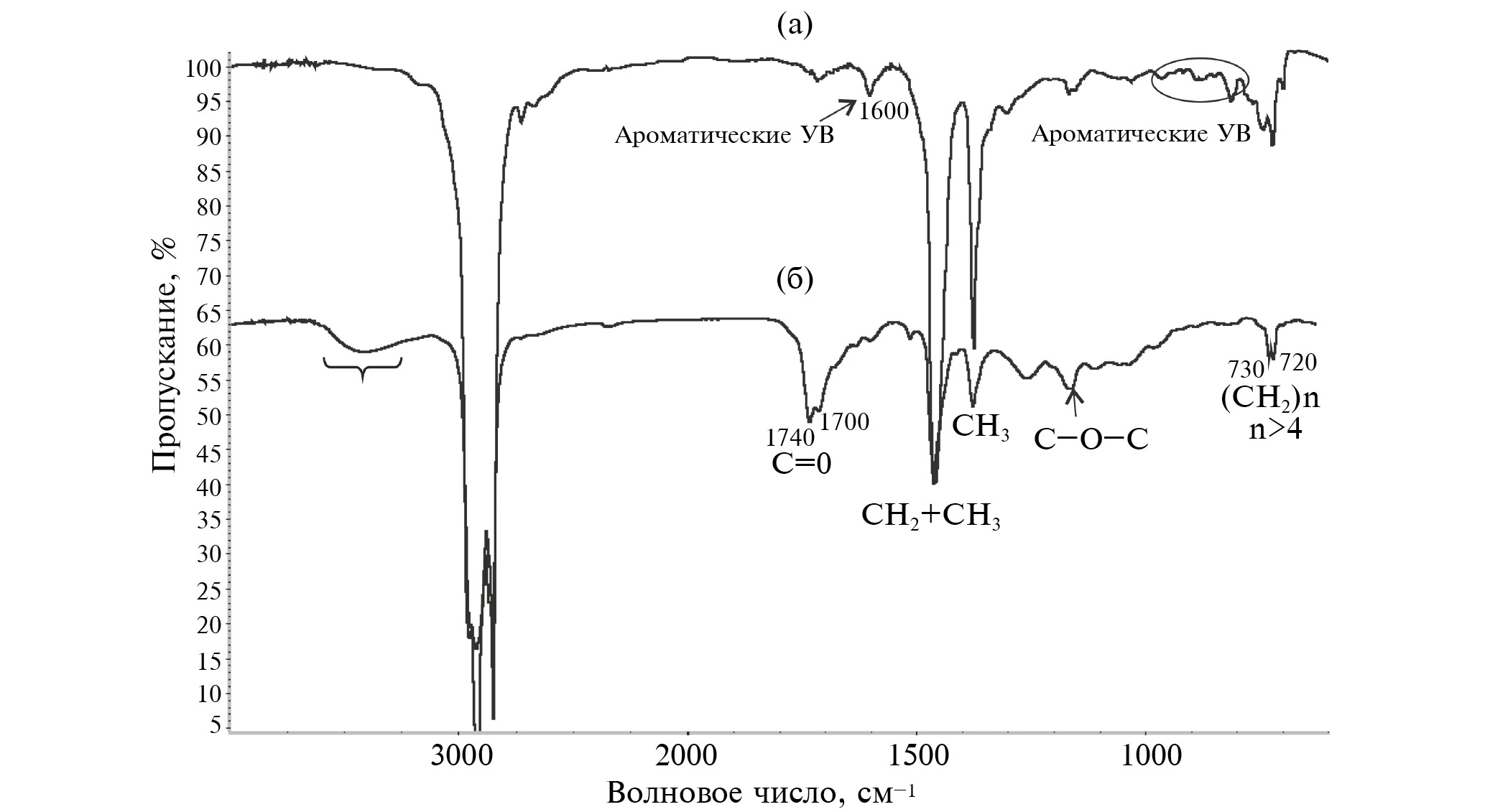 Присутствие нефтепродуктов в ДО подтверждают результаты ИК-Фурье-спектроскопии, согласно которым в ХБ ДО устья р. Амбарной в 2020 г. преобладали алифатические соединения, полосы поглощения (п. п.) – 720 см-1. Кроме того, увеличилось содержание ароматических УВ в области п. п. 750, 810 см-1, соответствующих поглощению незамещенных атомов углерода в бензольных кольцах, и п. п. в области 1600 см-1 – валентные колебания связей С = С в ароматических циклах (рис. 9а). Алифатические УВ представлены соединениями с меньшим числом метиленовых групп в цепи, о чем можно судить по отсутствию дублета для высокомолекулярных н-алканов в области 720–730 см-1, характерных для спектров УВ в ДО на фоновых участках. Это указывает на участие в структуре ХБ ароматических УВ (возможно, ПАУ), которые содержатся в составе ДТ. Через год на ст. N11, где содержание УВ уменьшилось в 149 раз по сравнению с 2020 г., в ИК-спектре отмечено увеличение количества кислородсодержащих соединений – карбонильных (п. п. 1710, 1740 см-1), эфирных (п. п. 1170 см-1) и гидроксильных (п. п. 3300–3400 см-1) групп (рис. 9б). Последнее может указывать на активно идущие процессы трансформации УВ из-за окислительной деструкции ДТ с образованием карбоновых кислот и сложных эфиров.