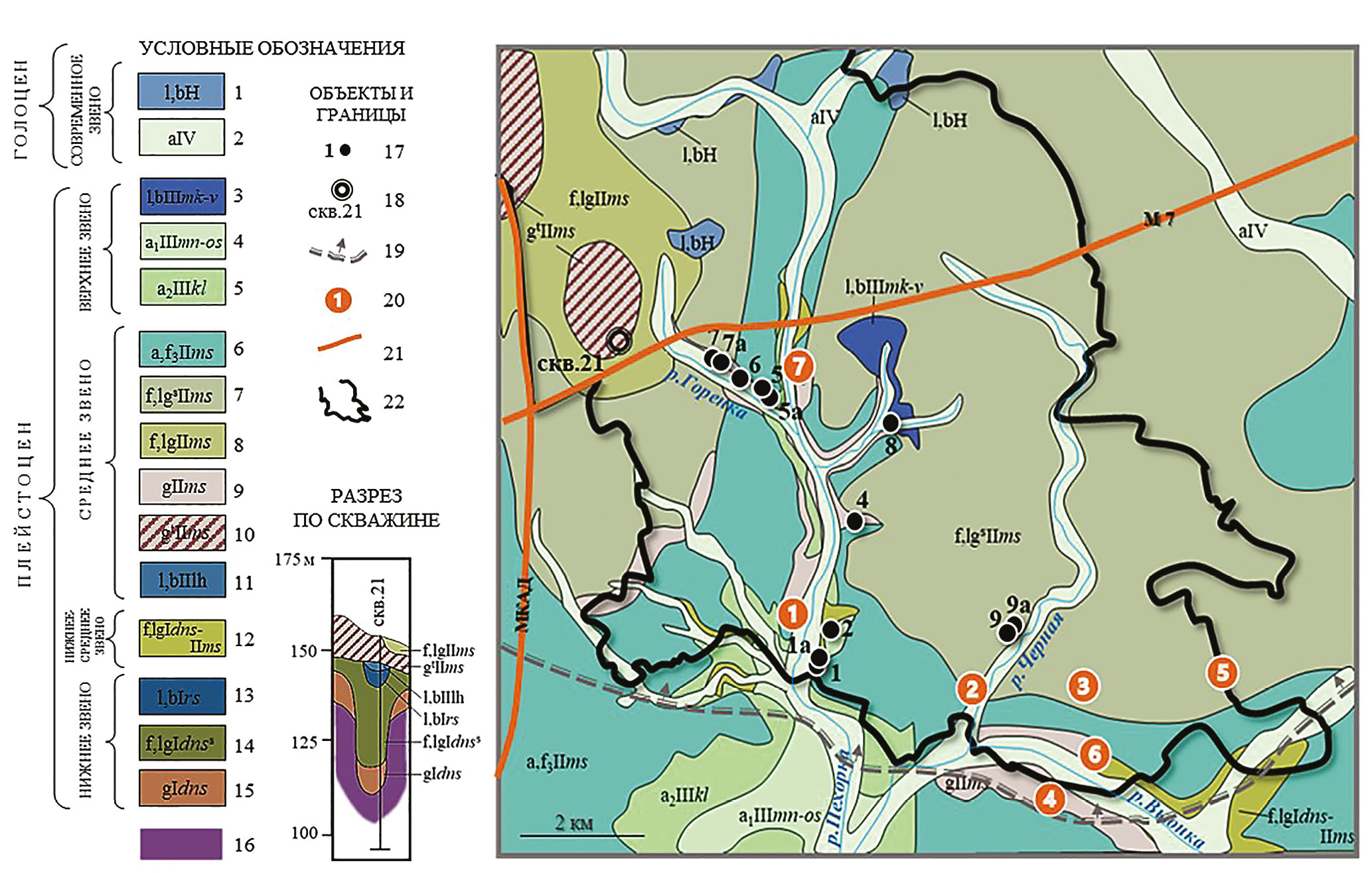 Рис. 1. Схема расположения точек опробования родников в южной части городского округа Балашиха. Основа – гео логическая схема четвертичных отложений района исследований (составлена по материалам [4, 5, 6]). 1 – озерные и болотные отложения; торф, оторфованные суглинки, сапропели (до 6–8 м); 2 – аллювиальные отложения пойм; пески с гравием и галькой, суглинки, супеси, местами оторфованные (до 20 м); 3 – микулинский горизонт – валдайский надгоризонт; озерные и болотные отложения; глины, суглинки, супеси с прослоями торфа, песка (до 16 м); 4 – мончаловский-осташковский горизонты; аллювиальные отложения первой надпойменной террасы; пески, суглинки, в основании песчано-гравийные отложения (до 16 м); 5 – калининский горизонт; аллювиальные отложения второй надпойменной террасы (до 8 м); 6 – московский горизонт; аллювиально-флювиогляциальные отложения третьей надпойменной террасы (в области московского оледенения); пески, супеси (до 6–10 м); 7 – московский горизонт; водно-ледниковые отложения времени отступания ледника; пески, супеси, суглинки (до 14 м); 8 – московский горизонт; водно-ледниковые отложения времени максимального распространения ледника; пески, супеси, суглинки (до 12 м); 9 – московский горизонт; ледниковые отложения-основная морена; суглинки с гравием, галькой и валунами, отторженцы дочетвертичных отложений (5–25 м, иногда до 40 м); 10 – московский горизонт; ледниковые отложения-конечная морена; суглинки валунные, пески, валунно-галечные отложения (до 40 м); 11 – лихвинский горизонт; озерные и болотные отложения; глины, суглинки, торф (до 9 м); 12 – донской-московский горизонты; нерасчлененный комплекс водно-ледниковых, аллювиальных и озерных отложений; пески, супеси, суглинки (до 12 м); 13 – мучкапский горизонт; рославльская серия; озерные и болотные отложения; пески, глины, торф (до 10 м); 14 – донской горизонт; водно-ледниковые отложения времен отступания ледника; пески, суглинки, глины (до 27 м); 15 – донской горизонт; ледниковые отложения – основная морена; валунные суглинки с линзами песка и отторженцами дочетвертичных и четвертичных пород (обычно до 10–20 м, местами до 44 м); 16 – дочетвертичные отложения; 17 – родники, где проведен отбор воды; 18 – опорная скважина для геологического профиля четвертичных отложений; 19 – граница верхнегжельского водоносного горизонта; 20 – объекты антропогенной нагрузки на территории городского округа Балашиха (полигоны ТКО: 1 – Кучино, 2 – Саввино, 3 – Пуршево, 4 – Торбеево; карьеры: 5 – Купавна (песок), 6 – Русавкинский (известняк, доломиты); 7 – горнолыжный комплекс “Лисья гора”); 21 – крупные автомобильные трассы (МКАД и М7); 22 – граница городского округа Балашиха.