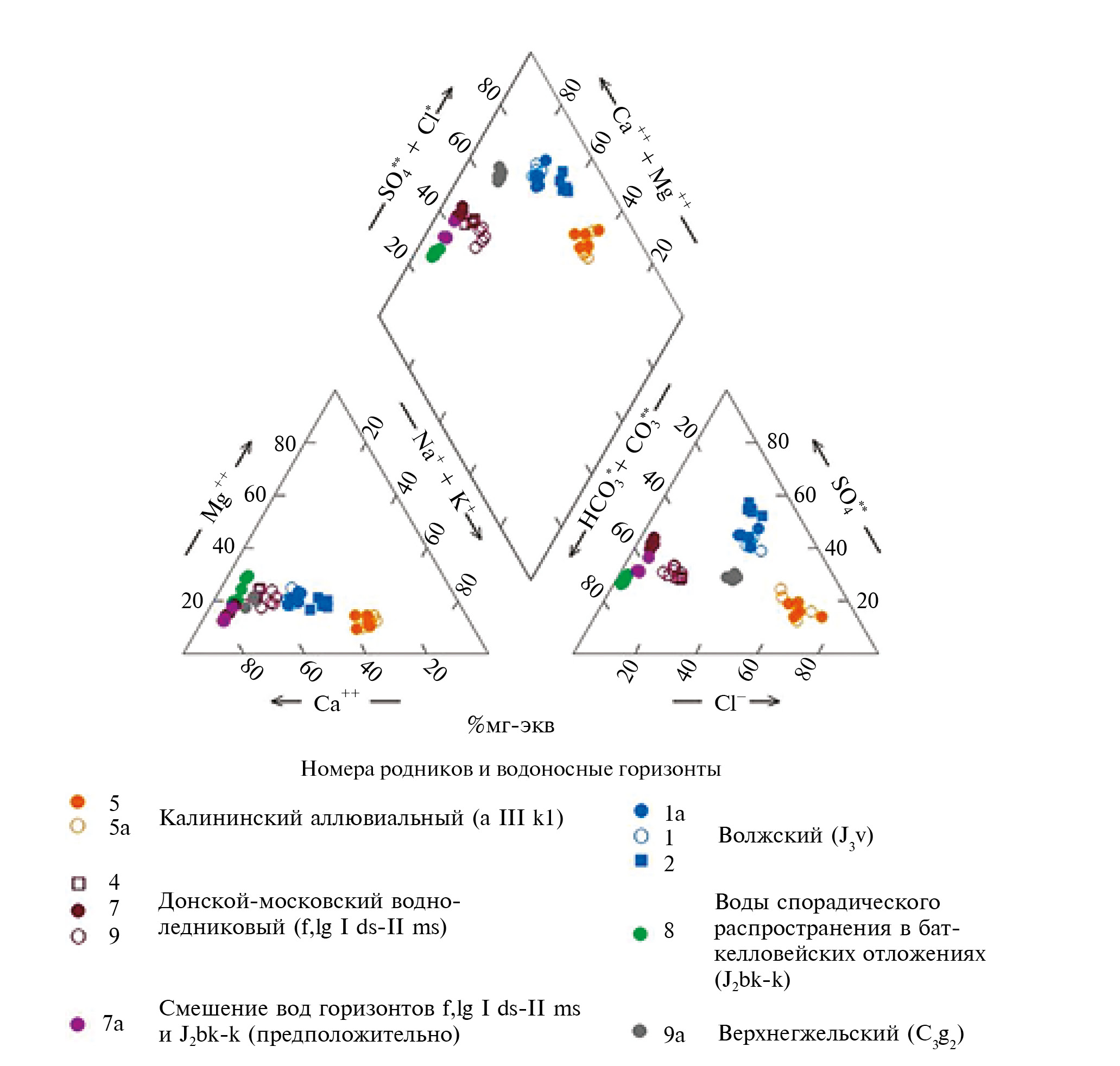 Анализируя материалы геологических и гид рогеологических карт масштаба 1:200 000 (листы N-37-II, N-37-III) и объяснительные записки к этим картам [4, 6], а также учитывая результаты определения макро- и микроэлементного состава вод, можно сделать предположение, что опробованные родники дренируют шесть различных водоносных горизонтов: калининский аллювиальный (родники 5 и 5а), локально-слабоводоносный микулинско-калининский озерно-болотный (родник 6), донской-московский водно-ледниковый (родники 4, 7, 7а, 9), волжский (родники 1, 1а, 2), воды спорадического распространения в бат-келловейских отложениях (родник 8) и верхнегжельский водоносный горизонт (родник 9а).